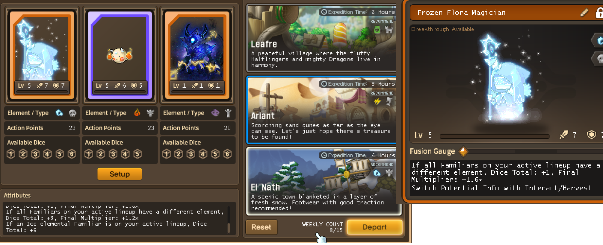 if you want to sweat frontier system you would want a wide variety of elements/types and all of them to have their corresponding "if you have x element on your squad +y to dice total/dice total minus y and increase final multiplier"everything else is based on random chance for not nearly as good of a payoffbased on the datamined lines it seems like there's 7 elements and 9 types so that would be 63 familiars to cover everything (assuming there is a familiar for every possible combination), trying to have a squad of 3 for every single type is impossible without dumping a metric shit ton on familiar expansion slots but it's still unknown how much of an impact matching the element and type do to the potential rewards