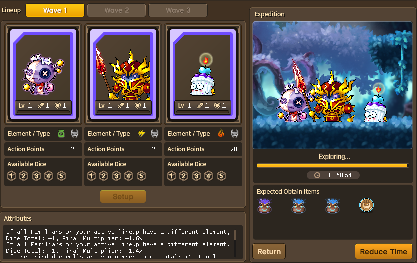 https://www.youtube.com/watch?v=nwB1R7HR9qs>If you have at least 1 familiar that matches the recommended element or type in your expedition team, you'll receive an expedition potential that matches the rank of your familiar's potentialOkay so it seems like the familiar type and element does not matter for rewards, only the starting bonus skillThis means the best strat is to get 9 legendary/unique familiars for each element with a good skill and the rest of the team can be filler that has decent base die and mult