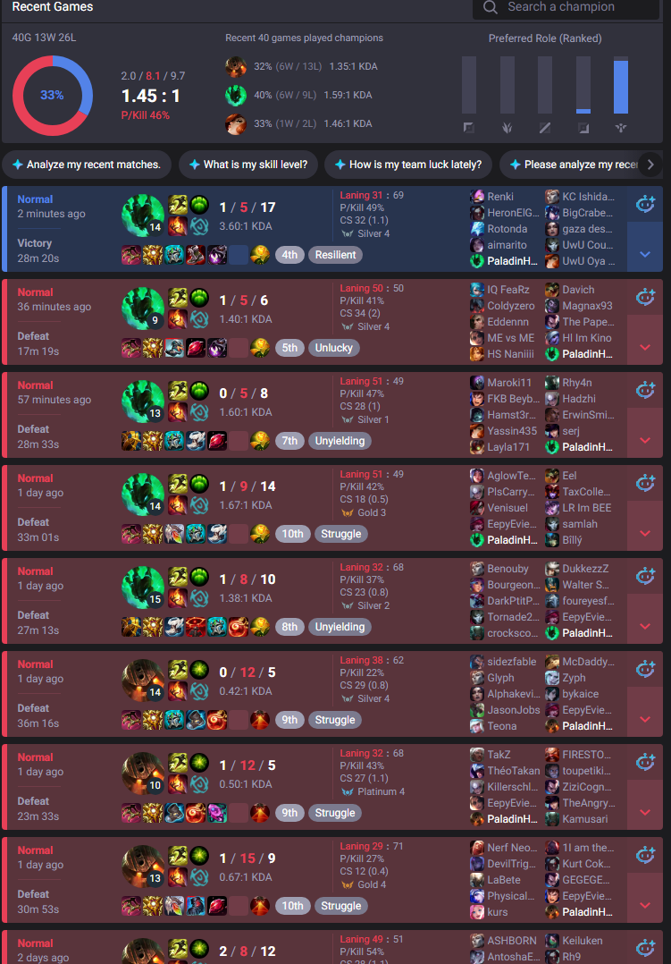 >>550140257tilting is the worst thing you can do in this game, it increases the chances of many mistakes. There's a reason why people stop queuing when they get tilted