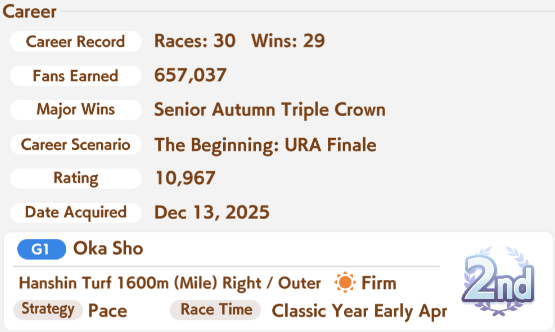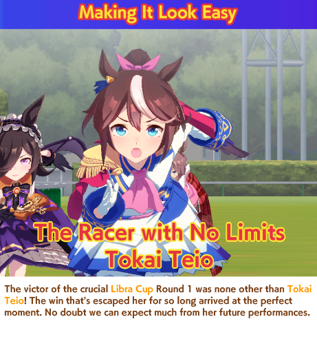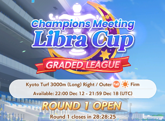 Libra Cup Round 2 starts today.Previous: >>549978934>Global Game NewsUmamusume wins Best Mobile Game at Game Awards 2025Current Scenario: Aoharu Hai aka "Unity Cup"Current Specials Missions: Half Anniversary Part 2+3Current Rate Up: Manhattan Cafe (3*), Nakayama Festa (SSR), Sirius Symboli (SR)12/04 & 22 - Legend Races12/08 - Libra Cup - Kyoto Turf 3000m12/14 - Autumn Event12/18 - Kitasan Rerun12/24 - Fuji Event12/28 - Scorpio Cup - Tokyo Turf 2000mhttps://umamusume.com/news/100040/https://pages.snep.pw/uma/anni-skill-changes/>JP Game NewsCurrent Rate Up: Christmas Nakayama Festa (3* alt), Christmas Dream Journey (3* Alt), Gold Ship (SSR), Fenomeno (SSR)New Scenario "Yukoma Hot Spring" releasedTimeline: https://uma.moe/timeline>IP NewsUmamusume Cinderella Gray 2nd season started weekly airings on 10/5>Thread Clubshttps://rentry.co/umaglobalclublistYou must be E3 (20k points) to join a circle. Apply with /uma/ or /vg/ in your profile or post ID in the thread.>All Guides & Resourceshttps://rentry.org/uma26Game databasehttps://gametora.com/umamusume (Click the gear to switch between JP / global server info)A basic guide for newfagshttps://rentry.org/umaglobalFind networks if your region is blocked from the game or clienthttps://www.umavpn.top/93Seiyuu & Concertshttps://rentry.org/umstUma storieshttps://umareader.idsmile.xyz/
