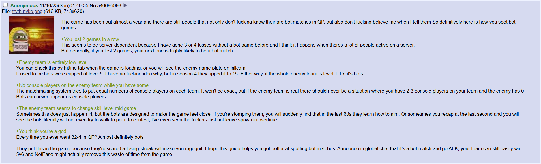 >>550078347>bot matches have nothing to do with player count, its to give you a win after a lossYes, I'm aware. But normally this is 1 bot match for every 2 losses. I have been on winning streaks, lost ONE (1) match and been thrown to the bots.>This game is insanely successful+30 Social CreditIt averages less viewers than Overwatch and only a couple months ago was at like 40k average players