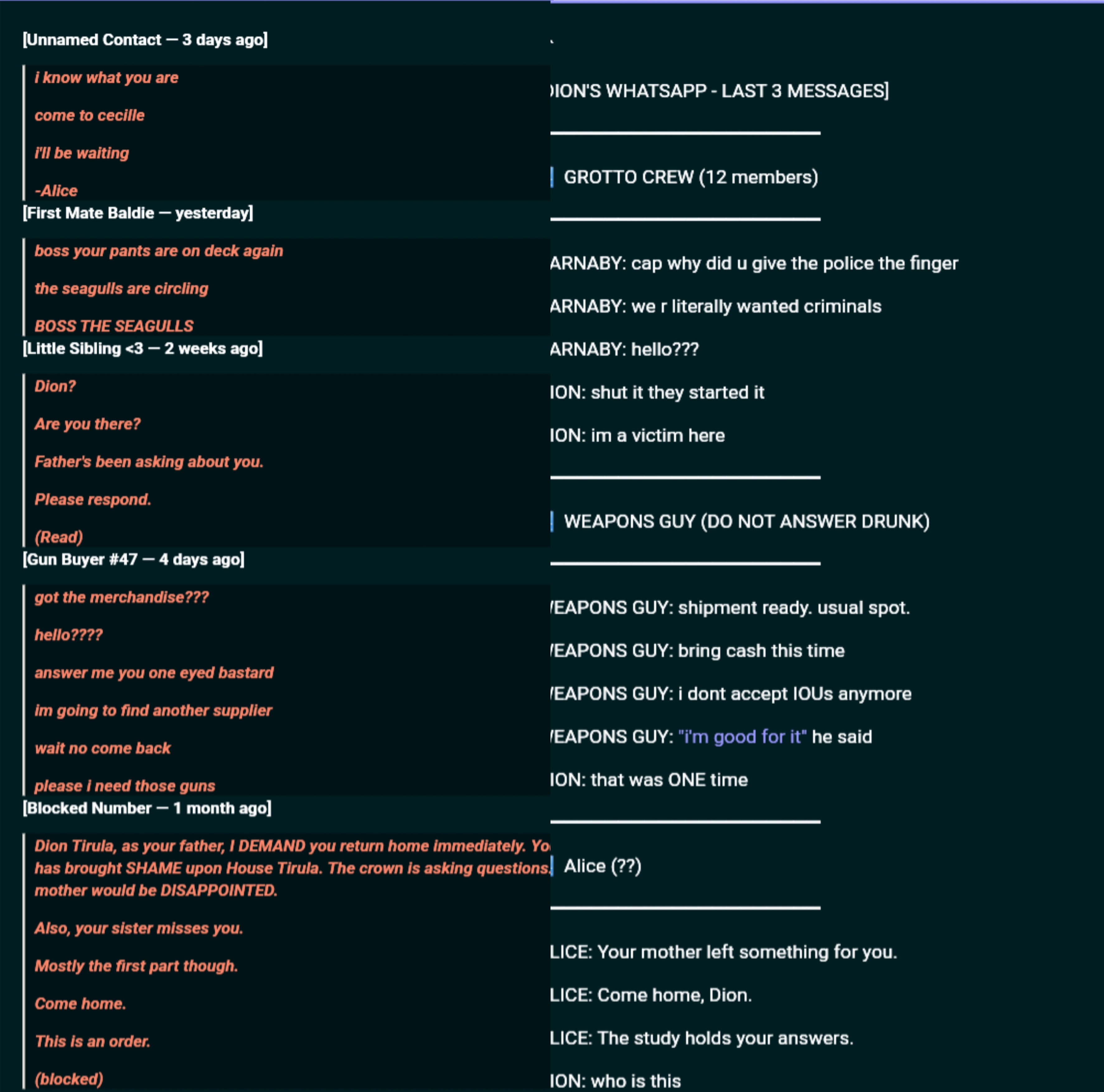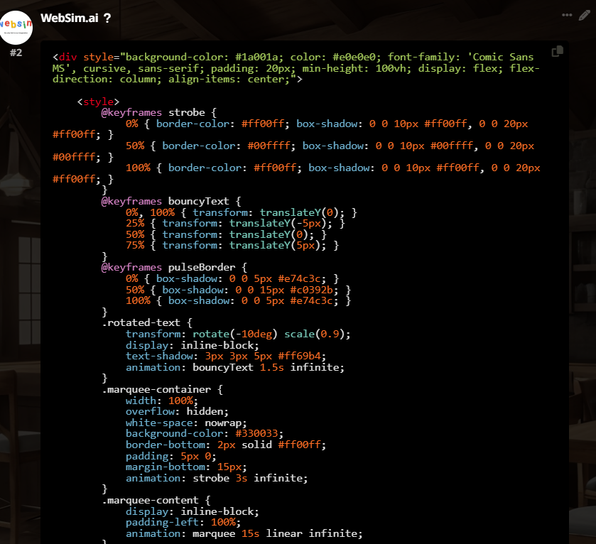 1. World Representation: HTML represents in-world objects (screens, posters, books, signs, letters, logos, insignias, crests, plaques, seals, medallions, coins, labels, and more.), but employ HTML/CSS for anything in-world which could be represented. These can be minor details or major; integrate interactive elements into your generation.