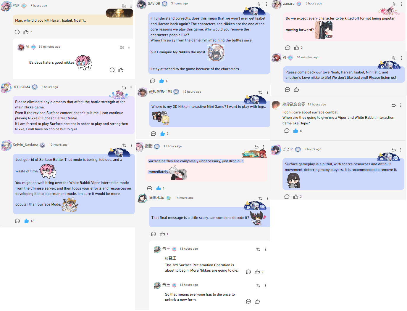 >>550240216>before it was too lateThey are saying that, if they didn't kill anyone when the Queen descended, they couldn't have justified killing anyone in any other circumstance.This is why I'm sure they will not kill any other playable Nikke (at least permanently) until the final confrontation.