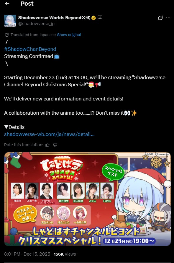 Game is dying so they are Spamming Collabs to milk their players instead of addressing any of the issues that caused a 90% drop in players in just 6 months, they are not even trying to salvage the game that they drove to the ground. this alone should be telling you that the Christmas stream will be an absolute trainwreck that you will remember for years to come.Enjoy your sleeves ShadobaTards while every other game from the same developer gets the usual freebies that they get every year for 11 years now