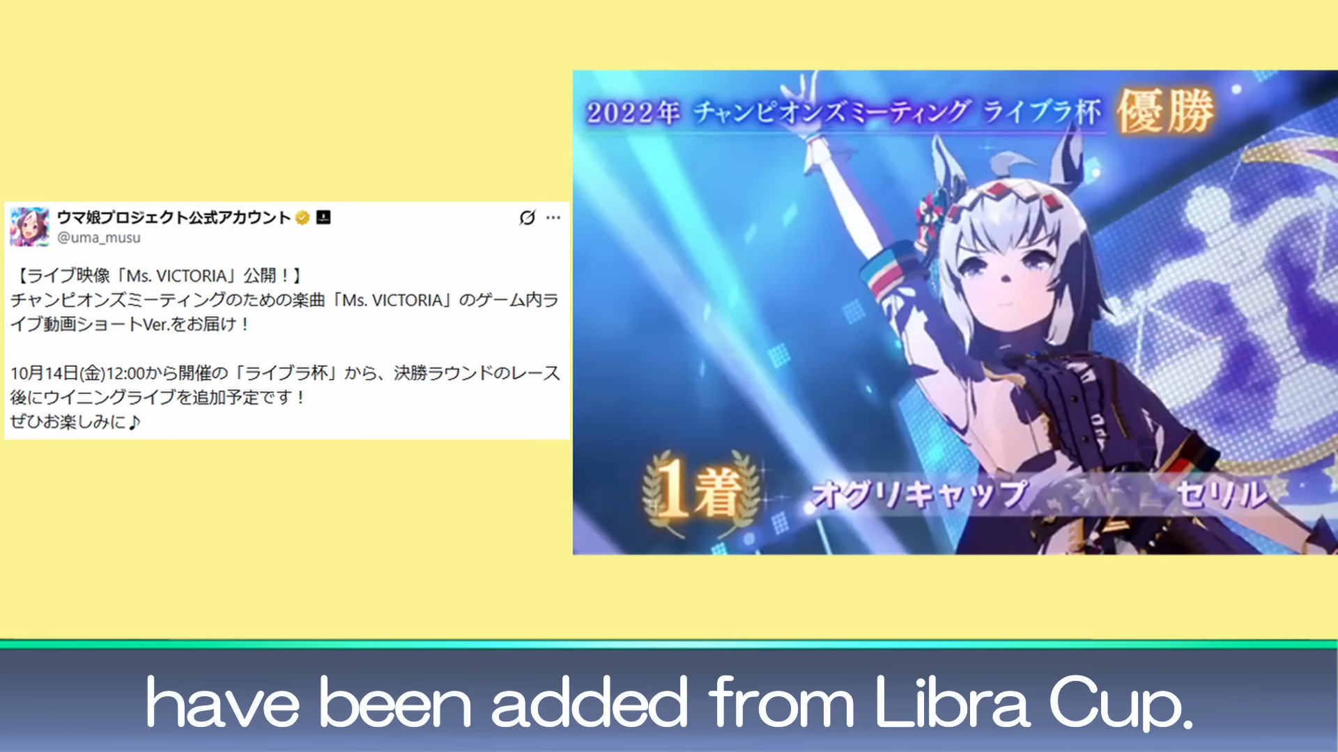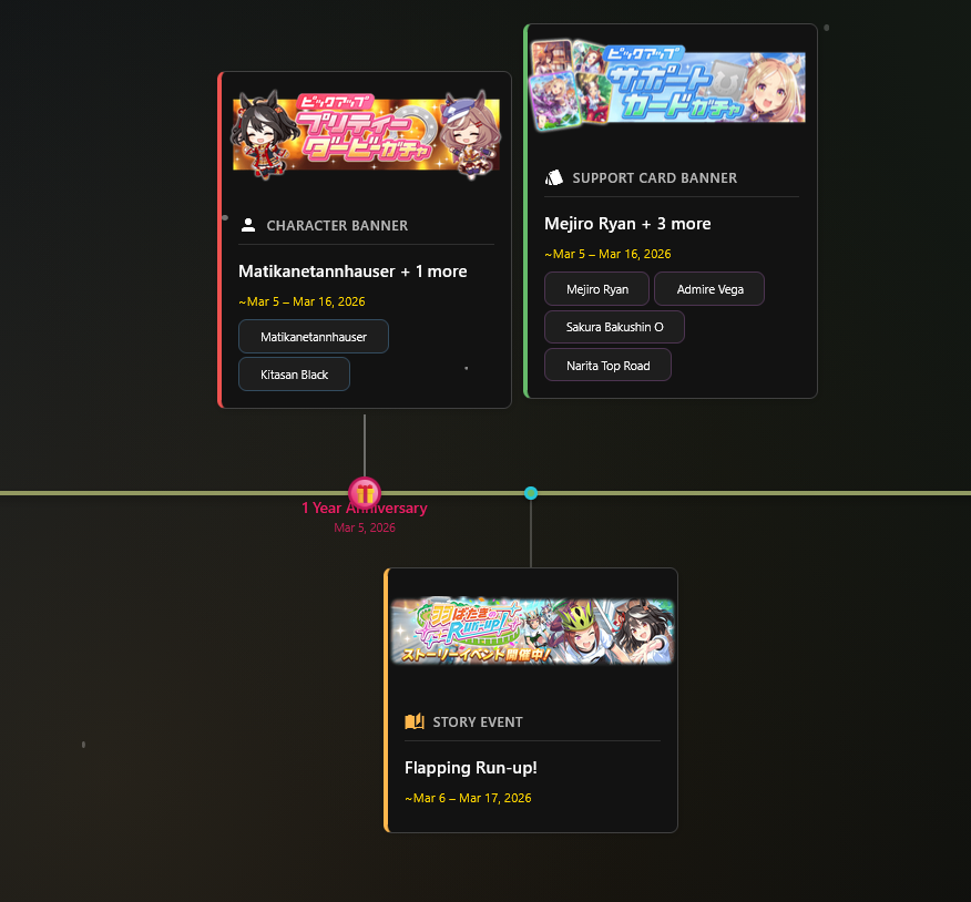 Previous: >>550224468>Global Game NewsUmamusume wins Best Mobile Game at Game Awards 2025Current Scenario: Aoharu Hai aka "Unity Cup"Current CM: Libra Cup - Kyoto Turf 3000mCurrent Event: Orchestra in Late AutumnCurrent Rate Up Trainee: Manhattan Cafe (3*), Symboli Rudolf 3* [Archer by Moonlight], Gold City 3* [Autumn Cosmos]Current Rate Up Support Cards: Nakayama Festa (SSR), Sirius Symboli (SR), Curren Chan SSR [Cutie Pie With Shining Eyes], Narita Brian SSR [The Whistling Arrow's Taunt]12/17 - CyGames ID Store link-up12/18 - Kitasan Rerun12/24 - Fuji Event12/28 - Scorpio Cup - Tokyo Turf 2000mhttps://umamusume.com/news/100040/https://pages.snep.pw/uma/anni-skill-changes/>JP Game NewsCurrent Rate Up: Oguri Cap 3* [Cinderella Grey] Inari One (SSR)New Scenario "Yukoma Hot Spring" releasedTimeline: https://uma.moe/timeline>IP NewsUmamusume Cinderella Gray 2nd season started weekly airings on 10/5>Thread Clubshttps://rentry.co/umaglobalclublistYou must be E3 (20k points) to join a circle. Apply with /uma/ or /vg/ in your profile or post ID in the thread.>All Guides & Resourceshttps://rentry.org/uma26Game databasehttps://gametora.com/umamusume (Click the gear to switch between JP / global server info)A basic guide for newfagshttps://rentry.org/umaglobalFind networks if your region is blocked from the game or clienthttps://www.umavpn.top/93Seiyuu & Concertshttps://rentry.org/umstUma storieshttps://umareader.idsmile.xyz/