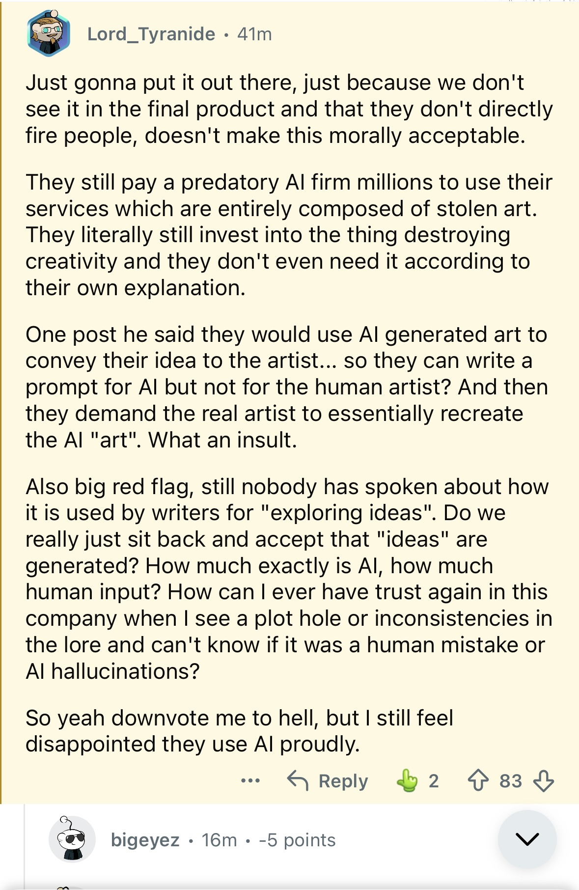 >>550395280>>550395058what is there to lie about unless they are actually using it to gen concept art, not just for research and referencing? no one says "yes my team uses google to look shit up", his tweet essentially says their use of AI is functionally the same. if he was directly asked about slop, then yea, he does have to mention it.