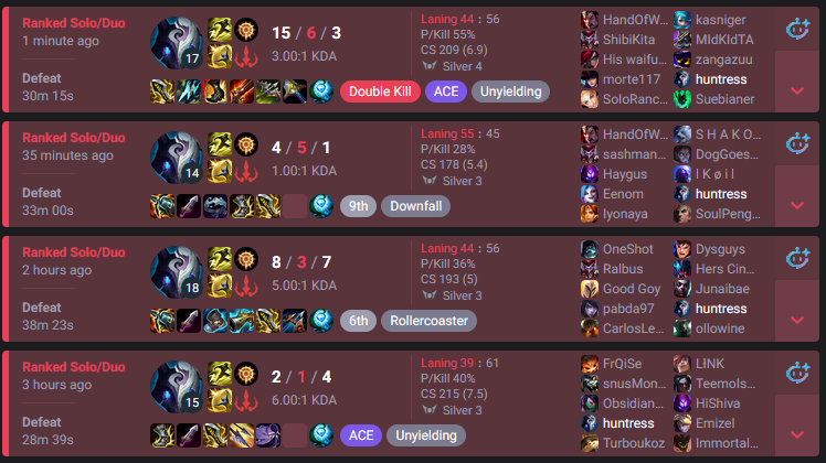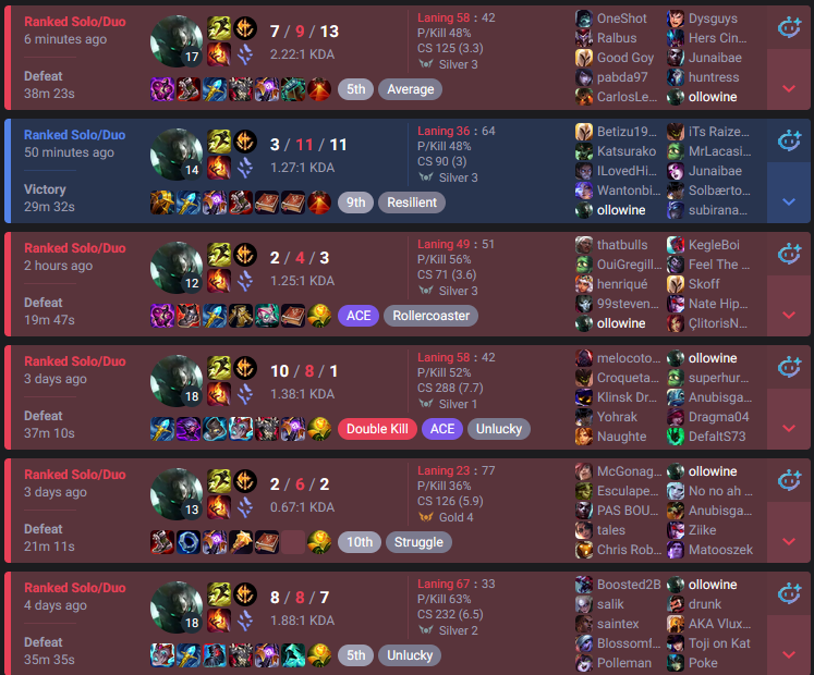 >>550361064A big problem of mine is knowing how to crawl back from losing games. Especially playing ADC. I’ve been playing corki and having fun in gold lately. It feels if ur jg falls asleep at the wheel the. You lose the game tho. Idk what to do when everyone just feeds into the meat grinder every time dragon spawns