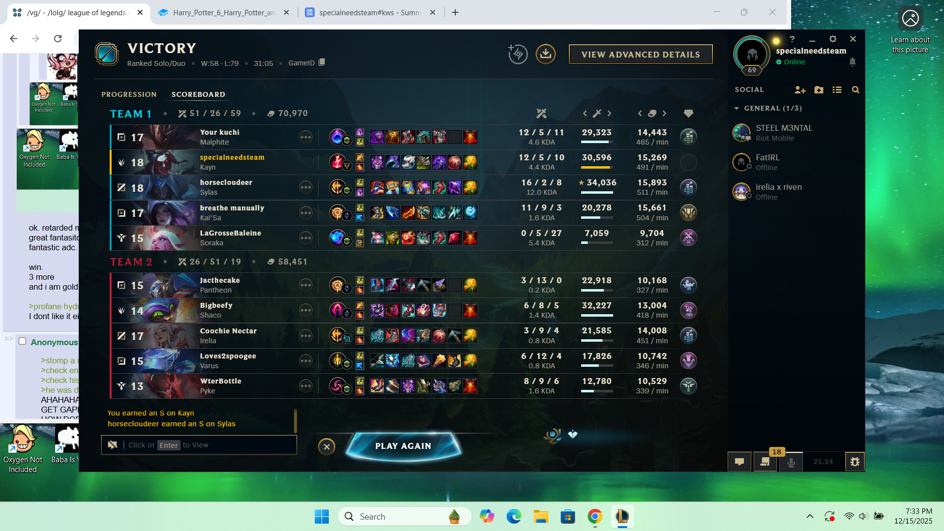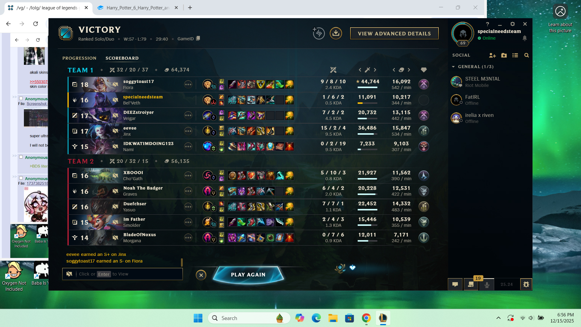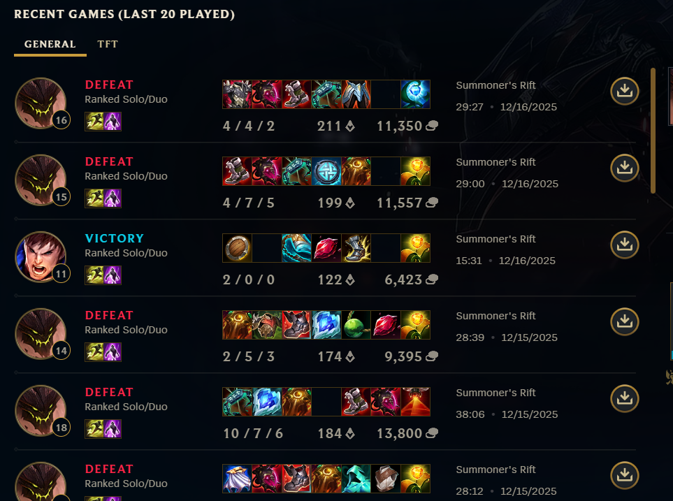 >>550369416players are fed up and very very easily give up on the game thesedays"this guy lived while we all dove in 4v5 and died, i dont like that so he doesn't deserve to win" or "this player is playing an easy malph/yuumi/whatever champ why should i give them a free ride for lp based on my effort? they should lose" type mentality