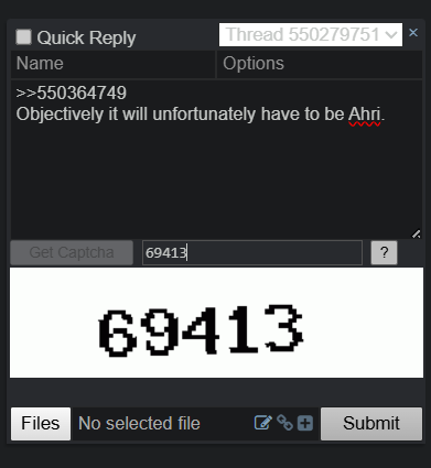 >>550364749Objectively it will unfortunately have to be Ahri.Also, what's going on with the clean captcha?