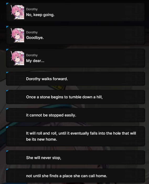 Overzone was one of the best showcases of nikke’s world and the effects it has the nikkes. The early main story and other extra shit was good at showing how brutal the Ark could be to nikkes but Overzone’s strength is showing her brutal the war is to nikkes. The core idea of Overzone (and any nikke story when its good, and really nikke as a whole) is the relationships that help and save nikkes from the trials they face. The story opens on Goddess Squad facing the trials of the surface and fighting in a fractured state where each member has recoiled into the darkness of their own heart. But Pinne is able to reach out to Dorothy and inspire her. And in turn, Dorothy reaches out to her squad, reminding them of the heroes they’re meant to be. Through this, the Goddess Squad is saved and returned to glory. But, as you know, Pinne meets the cruel fate of corruption, and Dorothy has to return the favor and “save” her once savior by fucking killing her. Instead of this dragging Dorothy back into an even deeper darkness, they corrupt the idea of bonds saving nikkes by having Dorothy’s sanity be saved, but this time having the bond come in the form of a hollow, unhealthy savior. This is resolved somewhat by having Snow White help Dorothy get it together again... but since having someone to be her best self for is so core to Dorothy, and since the Ark destroyed the possibility of her having anyone by causing Pinne to die and rejecting Dorothy, Dorothy has a scar etched upon her heart that prevents her from fully recovering.1/2