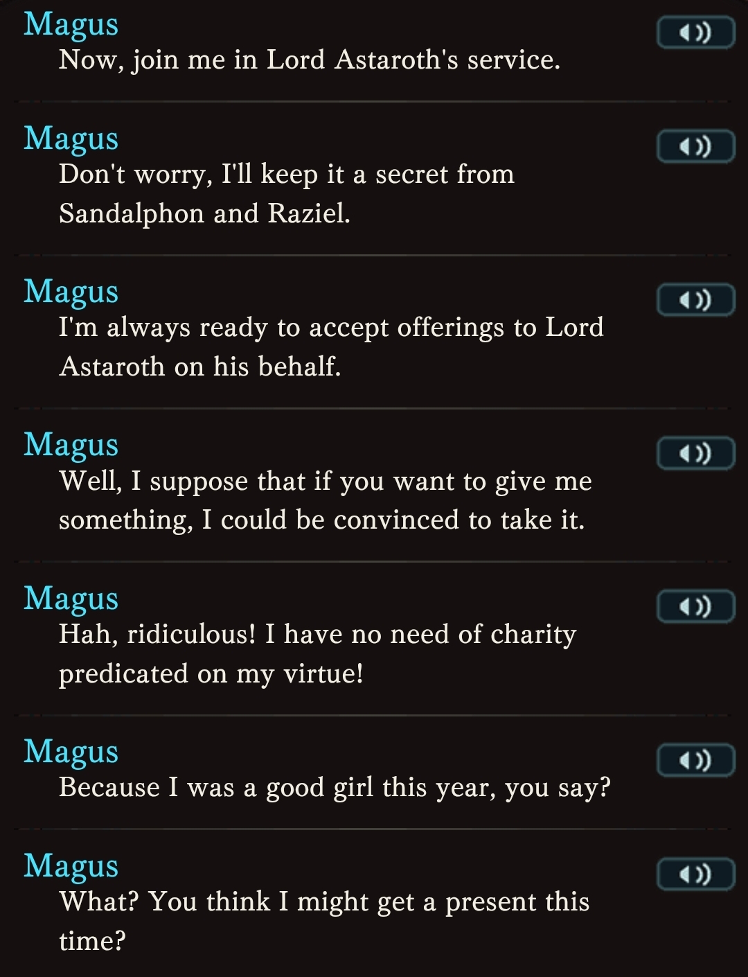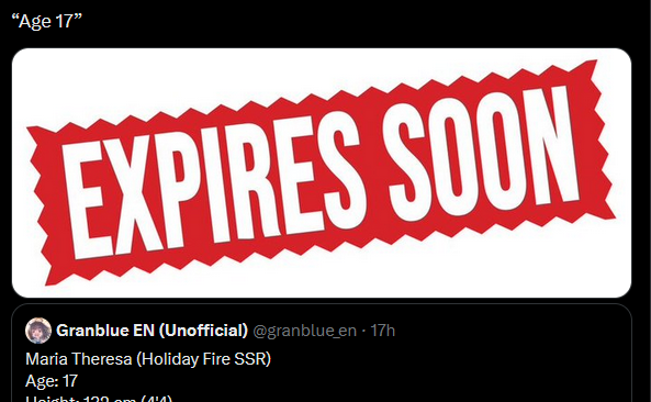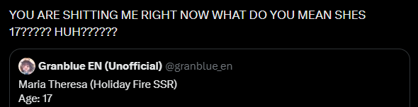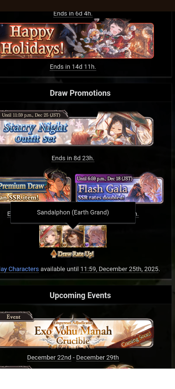 >Flash GalaC.Maria Theresa (Fire) & C.Zeta (Dark). G.Sandalphon (Earth) is also on rate up.>Recent NewsGranblue Fantasy Winter Campaign - (12/15 - 12/23)Daily Draw/200 Crystals, MSQ Rewards, CEQ, 1.5 XP/RP, ½Off AP/BP/Hosts & Sandbox Defender boost etc.MSQ & Lucio Grand L2D Home Screen - LiveQoL: Abandon Raid Update - LiveGrand Cain FLB - LiveMichael Christmas Skin added to shop - LiveSide Story: "Make Up and Go!" - 12/19New Main Story Arc - DecemberNew Raid series - DecemberRoadmap: https://gbf.wiki/User:Umikin/Timeline>December Schedule12/15 - 12/22 - A Ballad of Unbending Chivalry Rerun12/15 - 12/30 - Holiday Messages12/22 - 12/29 - Exo Vohu Manah12/25 - 12/29 - Auld Lang Syne12/29 - 01/06 - Story Event>Future Schedule01/21 - 01/28 - Unite & Fight (Earth Advantage)>How to StartGo to https://game.granbluefantasy.jp in any Chromium-based browser>READ THE FAQ before posting - It will answer most of your questions if you're new or learninghttps://gbf.wiki/FAQ>Helpful links - These links contain useful information like important guides and other stuffGranblue Fantasy Toolbox - https://mizagbf.github.io/GBF Advanced Search - https://gbfas.ioGBF Grid and Teambuilding - https://gbfguide.comMain Story Recap - https://calico.nekoweb.org/gbf/story/Wiki Advanced Grids - https://gbf.wiki/Advanced_Grids/gbfg/ Mega Pastebin - https://pastebin.com/xHkyQTy8/gbfg/ Crew Directory - https://rentry.org/gbfgcrewsPrevious >>550236226