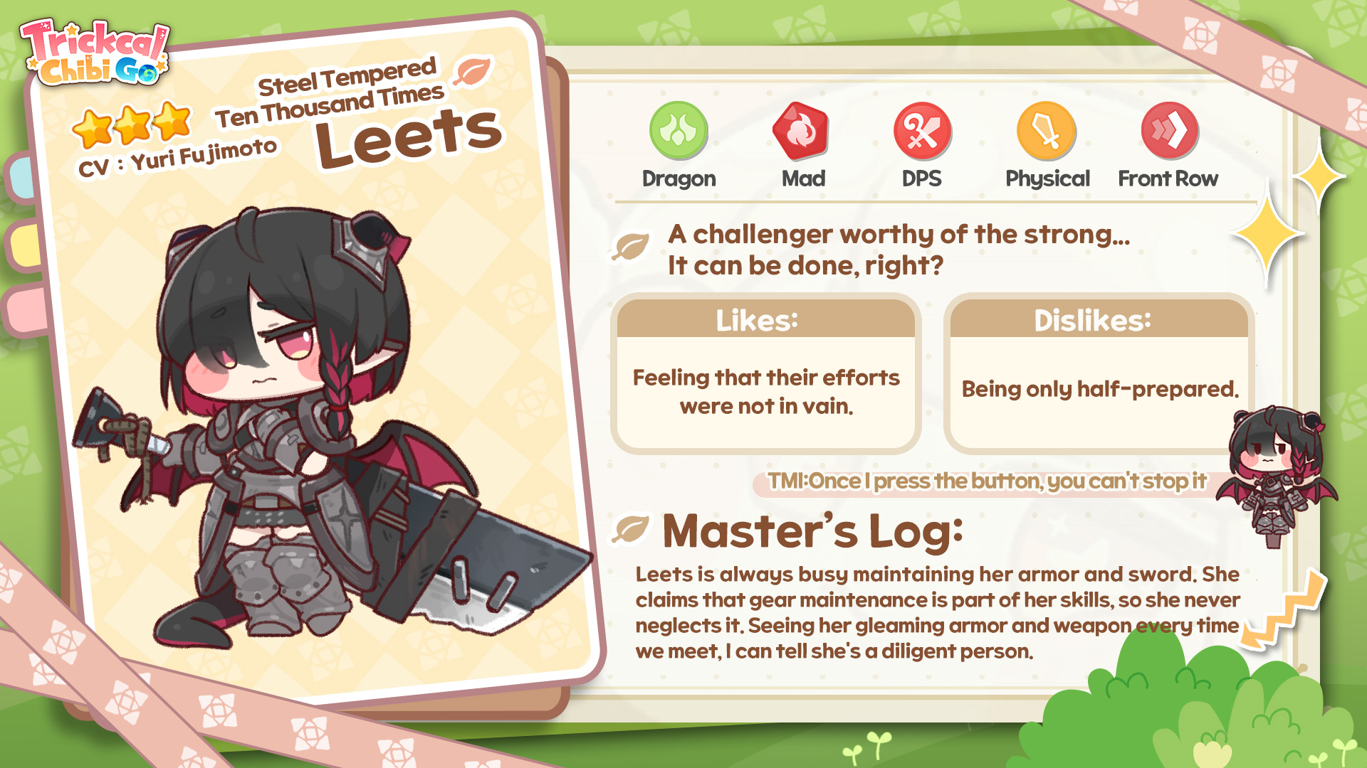 Previous: >>550194829/trick/ 9 edition>NewsKorean voice-over released, Japanese VA credits addedWorlds 23 and 24 have unlocked, main story updated to 5-6.New PvP Season begins>Banners(Chibi)12/4 | 12/18 Elena12/11 | 12/18 Amelia>Banners(Artifact)12/4 | 12/18 Elena's Enhanced Drone>On going events12/4 | 12/18 Oh Mayor, Mayor, My Mayor!>Website & downloadhttps://trickcal.biligames.com/en/>CodesTRICKCAL109TRICKCALOBTKRELEASETK777TK2025TKRANKINTRGAME8CP (Asia only)ZRJX01ZRJX02ZRJX03ZRJX04>NEW CODESSEF2025XEmotes: https://mega.nz/folder/m8xTlKrb#fgDs8qThgkfchyZ0Y68awA/trick/ guide: rentry.org/pincherguideKorean wiki: https://namu.wiki/w/분류:트릭컬%20리바이브Japanese wiki: https://wikiwiki.jp/honmonoEnglish guide (might be wrong, use at own risk): https://lootandwaifus.com/trickcal-chibi-goChibi database: https://soshage.com/trickcal/unitFood preferance: https://lsbim.github.io/foodsSweep Tool: https://noswork.github.io/trickcal/sweep>Weekday Farms (put /trick/ in bio before applying dumbass):NA/EU: Cheeky, Calamity, Trickkers, YomiNTR, Cope, Pinch, ShibiCex, Kommynists, HeadEmpty, ChibiChapa, DiamonDogs, ButterBunsAsia: trick, KisKoiKlan, SneedFeed>When will the next drawpile be?December 20th