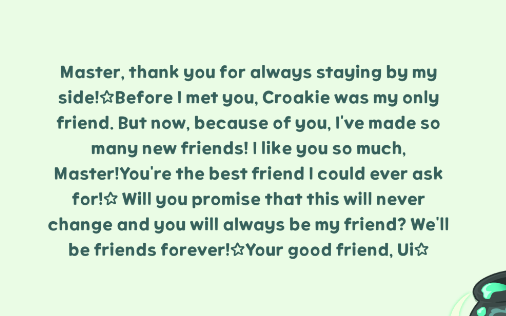 >>550389793The eternal life eldyne sisters all have a great love for the first human because Eldr told stories about her when the sisters were first born. Eldr gave them toys and things that she received from the first human (butterfly hairpin, bear keyring, frog wallet, etc), and those became ingrained in the identity of the sisters. After they were killed and reborn, Ui erased her memory and identity due to sadness, but she still vaguely remember the love for the human, turned the frog wallet into a real frog friend, and named her after the human although she got the name a bit wrong (due to Eldr being retarded).