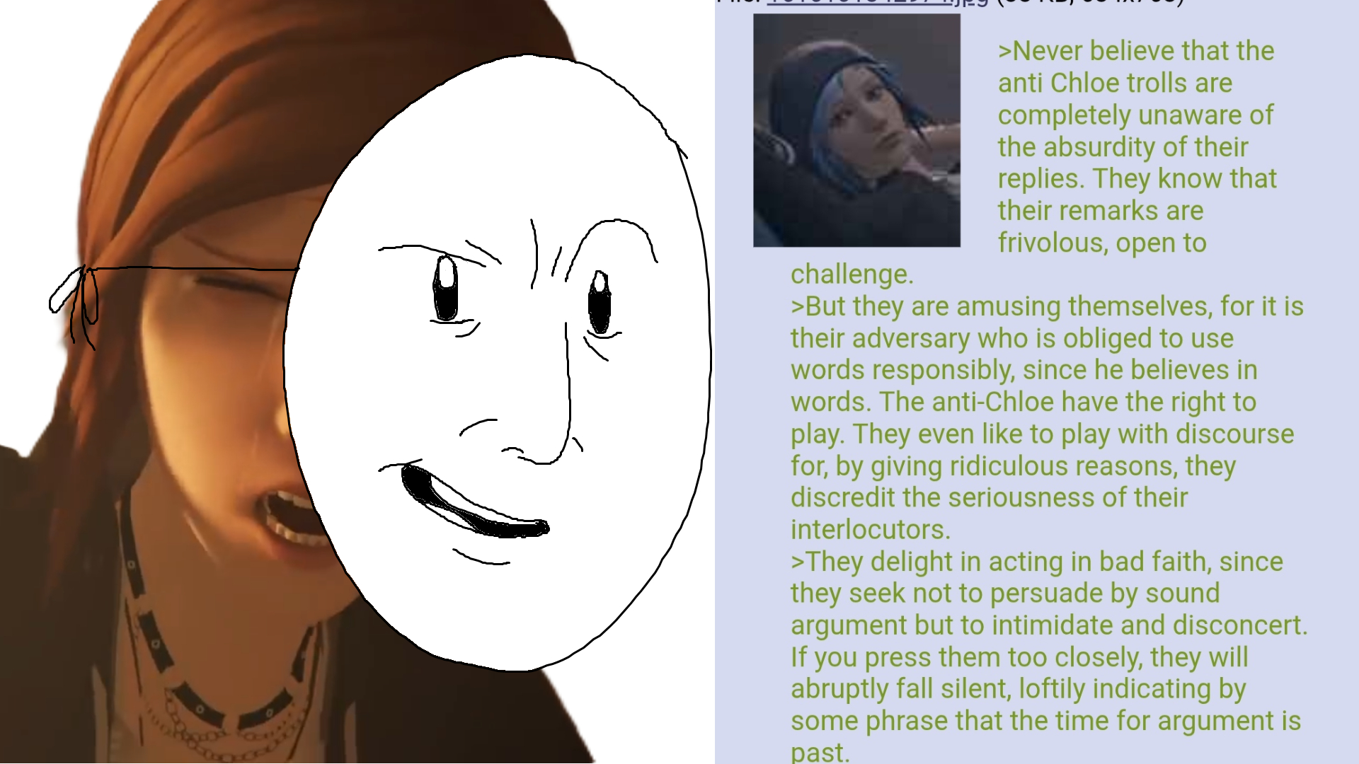 >Never believe that the anti Chloe trolls are completely unaware of the absurdity of their replies. They know that their remarks are frivolous, open to challenge.>But they are amusing themselves, for it is their adversary who is obliged to use words responsibly, since he believes in words. The anti-Chloe have the right to play. They even like to play with discourse for, by giving ridiculous reasons, they discredit the seriousness of their interlocutors.>They delight in acting in bad faith, since they seek not to persuade by sound argument but to intimidate and disconcert. If you press them too closely, they will abruptly fall silent, loftily indicating by some phrase that the time for argument is past.