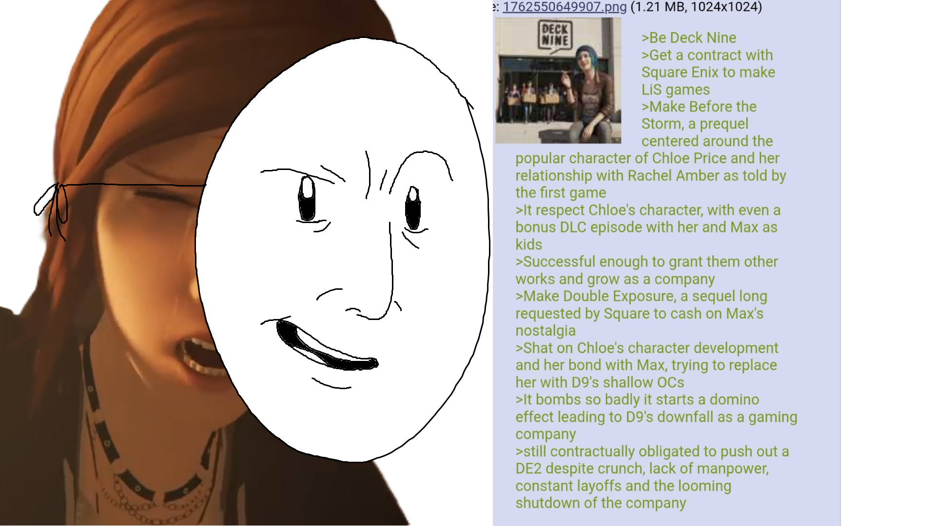 >Be Deck Nine>Get a contract with Square Enix to make LiS games>Make Before the Storm, a prequel centered around the popular character of Chloe Price and her relationship with Rachel Amber as told by the first game>It respect Chloe's character, with even a bonus DLC episode with her and Max as kids>Successful enough to grant them other works and grow as a company>Make Double Exposure, a sequel long requested by Square to cash on Max's nostalgia>Shat on Chloe's character development and her bond with Max, trying to replace her with D9's shallow OCs>It bombs so badly it starts a domino effect leading to D9's downfall as a gaming company>still contractually obligated to push out a DE2 despite crunch, lack of manpower, constant layoffs and the looming shutdown of the company