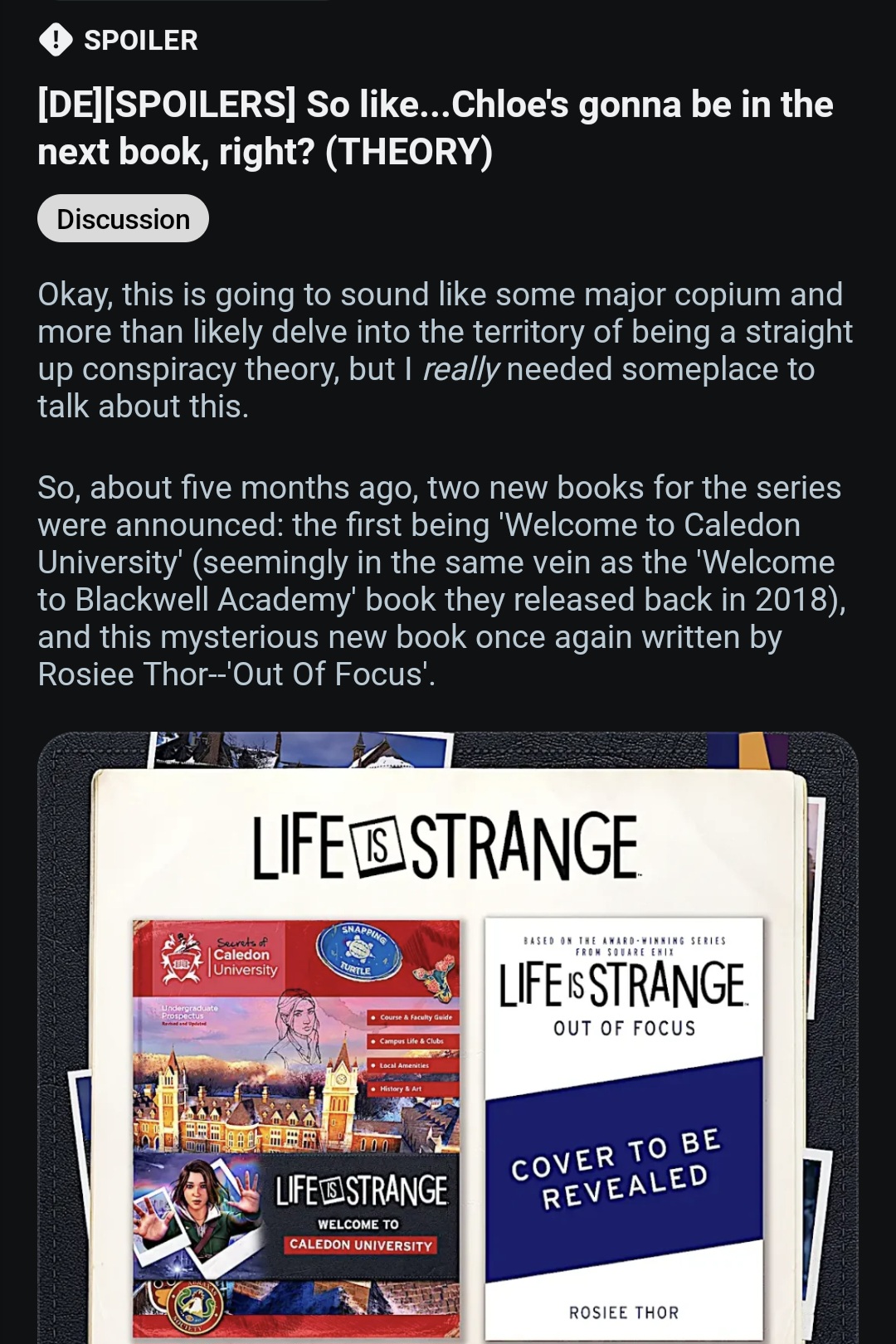>>550376590I wouldn’t put it past Deck Nine, especially if the book is meant to act as a bridge between DE and DE2. DE already makes it pretty clear through Crosstalk that Chloe’s working as some kind of band manager, so it doesn’t feel implausible. If she’s featured on the cover, it would make sense to keep that under wraps, and if the game is due to release next year.