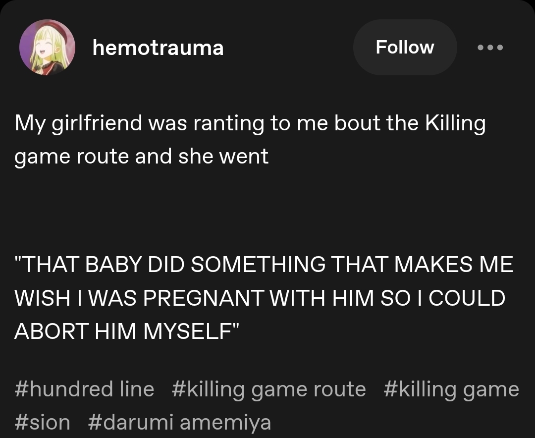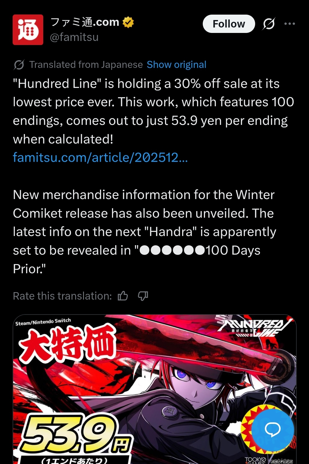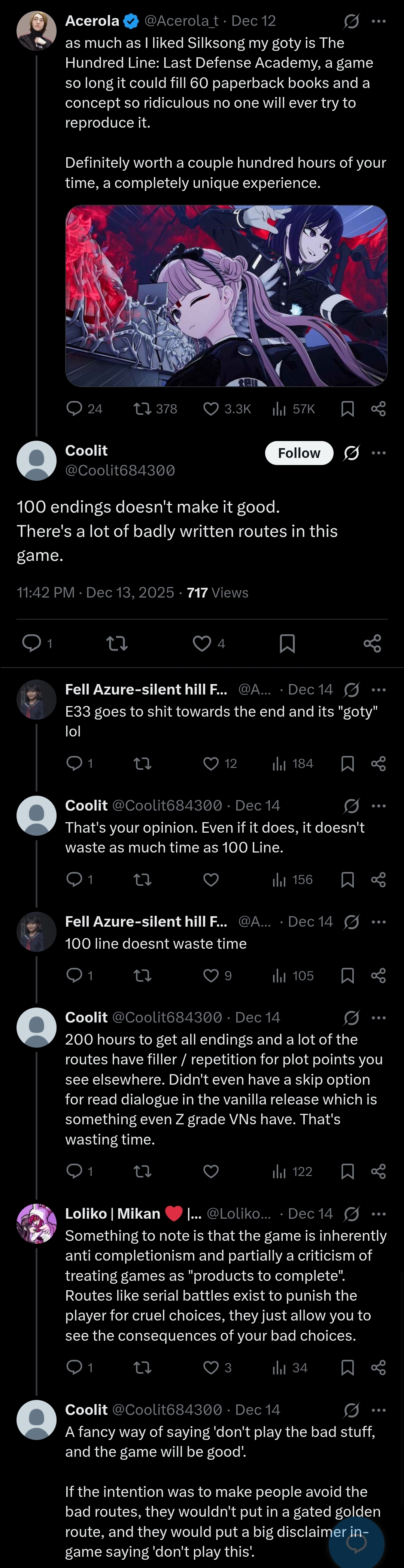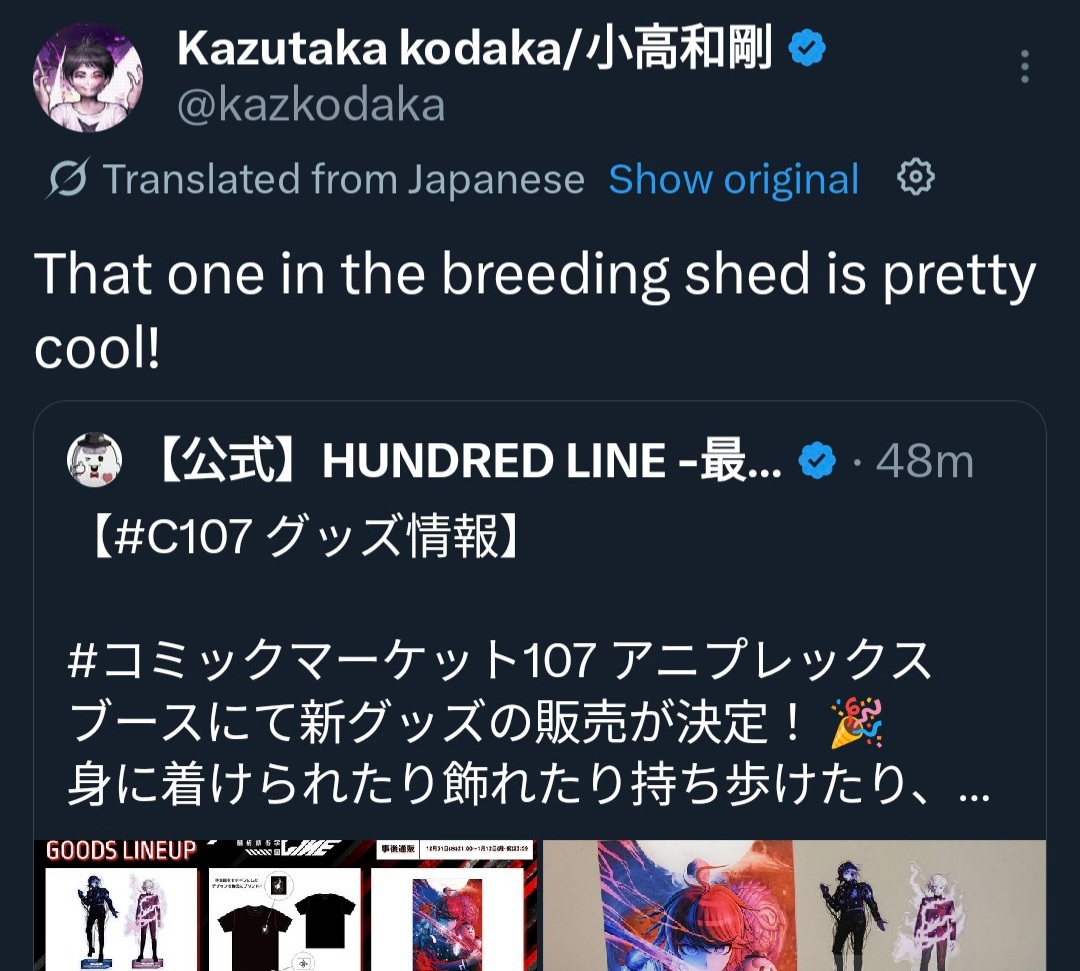 A general for the discussion of TooKyo Games' "The Hundred Line -Last Defense Academy-" Tactical RPG and adventure game written by Kazutaka Kodaka and Kotaro Uchikoshi.Previous thread: >>549779091Buy the game and play:>Steamhttps://store.steampowered.com/app/3014080/The_Hundred_Line_Last_Defense_Academy/>Switchhttps://www.nintendo.com/us/store/products/the-hundred-line-last-defense-academy-switch/Game information:>Official websitehttps://hundred-line.com/en/>Flowchart/Route guide (No Spoilers)https://arch-img.b4k.dev/vg/1746873993910.png>Flowchart/Route guide (Spoilers)https://arch-img.b4k.dev/vg/1747005823544.pngGame resources:>Former Lives of the SDU: File 03 – Hiruko Shizuhara’s First Battle (Novel)https://docs.google.com/document/u/0/d/1wAGYS0WiNCIPvbXfFF0UyhGgDP4LK7aMhbupLBOoHok>Character sprites, CGs, Cut-ins, and other assetshttps://drive.google.com/drive/folders/1vc56NSu3o-WGDAaFGVVk9n7cHmvD32J->Artbook (Character design sheets)https://drive.google.com/drive/folders/1xFZvHYyabQUCRw-myEcYwRKIF4qfcD_T>Complete Soundtrack Albumhttps://mega.nz/file/uAo0FQrC#yA1IxguTxIWvGEM0-E3GrJ4Csqm6KLLI70n2fBirrKALatest:>Hundred Line - Short Documentaryhttps://www.youtube.com/watch?v=KJ6mdf-Yscg>Interview with Kazutaka Kodaka, Tomoyo Kurosawa and Taihi Kimura (Spoilers for the 2nd scenario)https://news.denfaminicogamer.jp/interview/250508n>End of the creator's blog, Vol.14https://hundred-line.com/special/blog/detail/?p=14>Kodaka's weibo Q&A compilationhttps://docs.qq.com/sheet/DV2ZWRHFobVdrcWJ2>Kodaka's Interview with Bloomberghttps://www.bloomberg.com/news/newsletters/2025-07-11/-the-hundred-line-last-defense-academy-nearly-bankrupted-too-kyo-games>Kodaka is currently making the Darumi prequel novel>Dengeki Online Popularity Poll results:https://dengekionline.com/article/202510/51018>Kodaka's interview with DekuDealshttps://www.dekudeals.com/articles/kazutaka-kodaka-hundred-line-last-defense-academy-interview