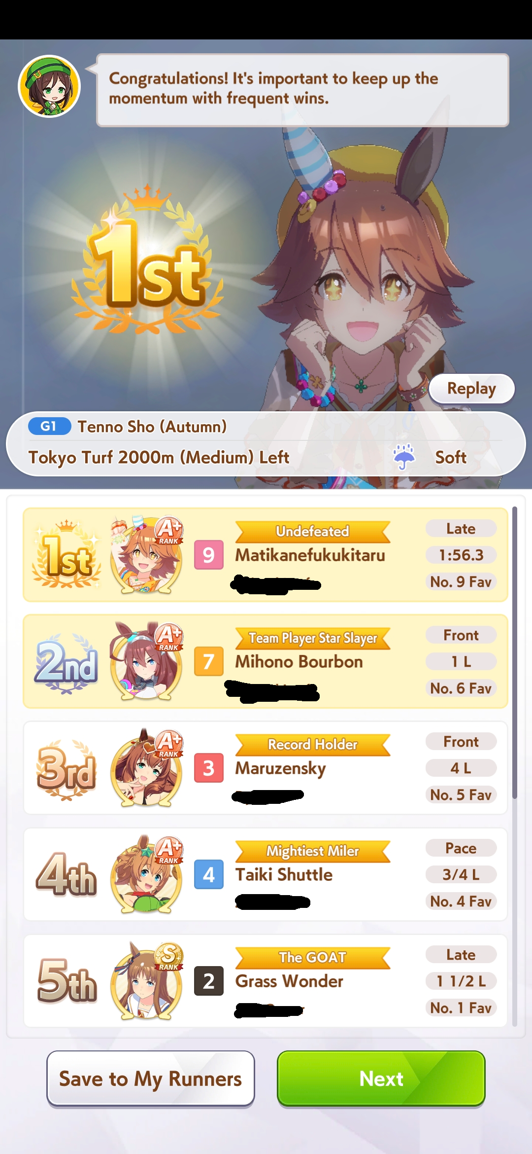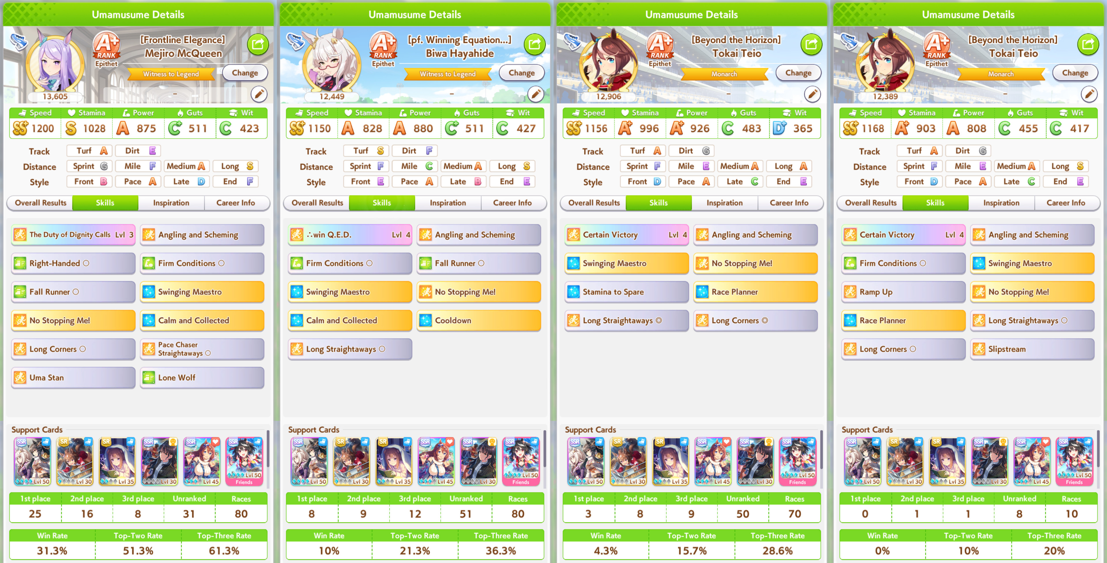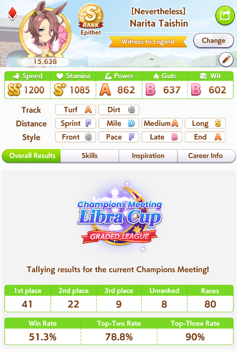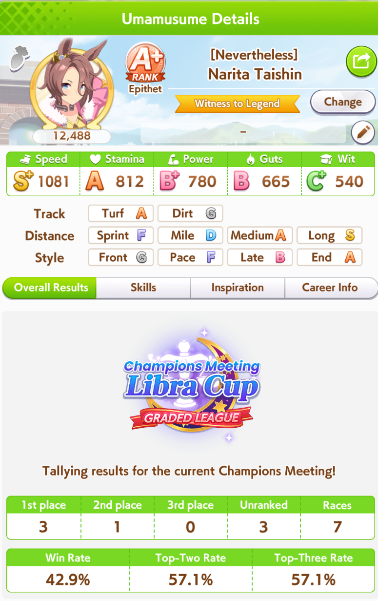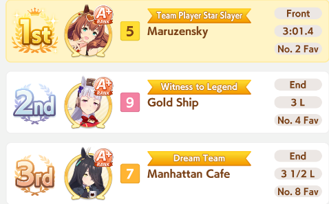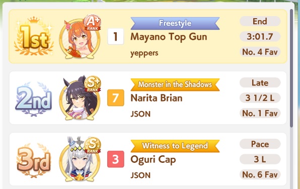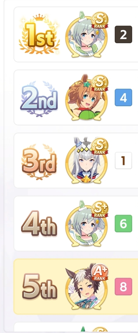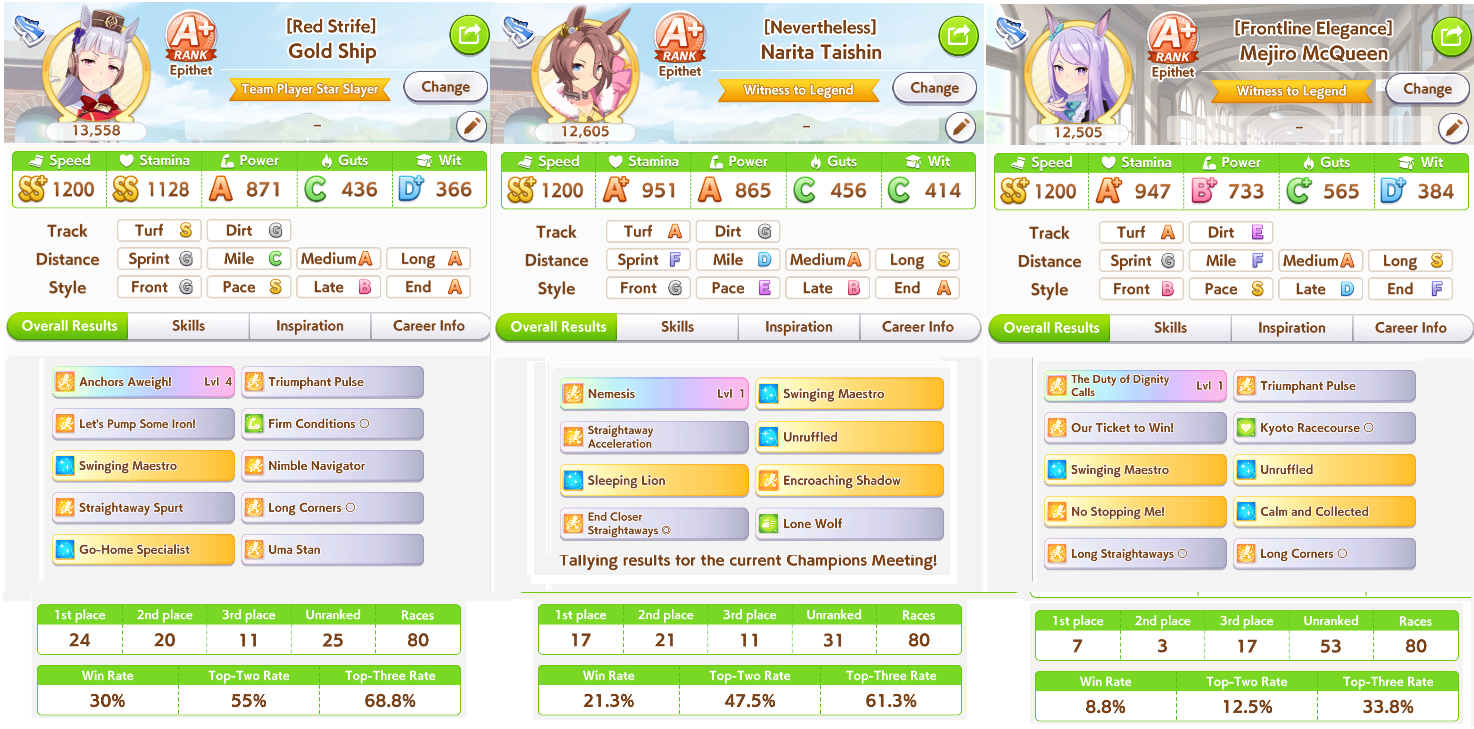 >>550386387I honestly don't get if I got unlucky so I got fed up and trained 3 new aces with long S and max speed and even then they got mogged by umas with less overall stats during the second to last round (2/5).Here's hoping I don't get lumped with whales or something during the finals.