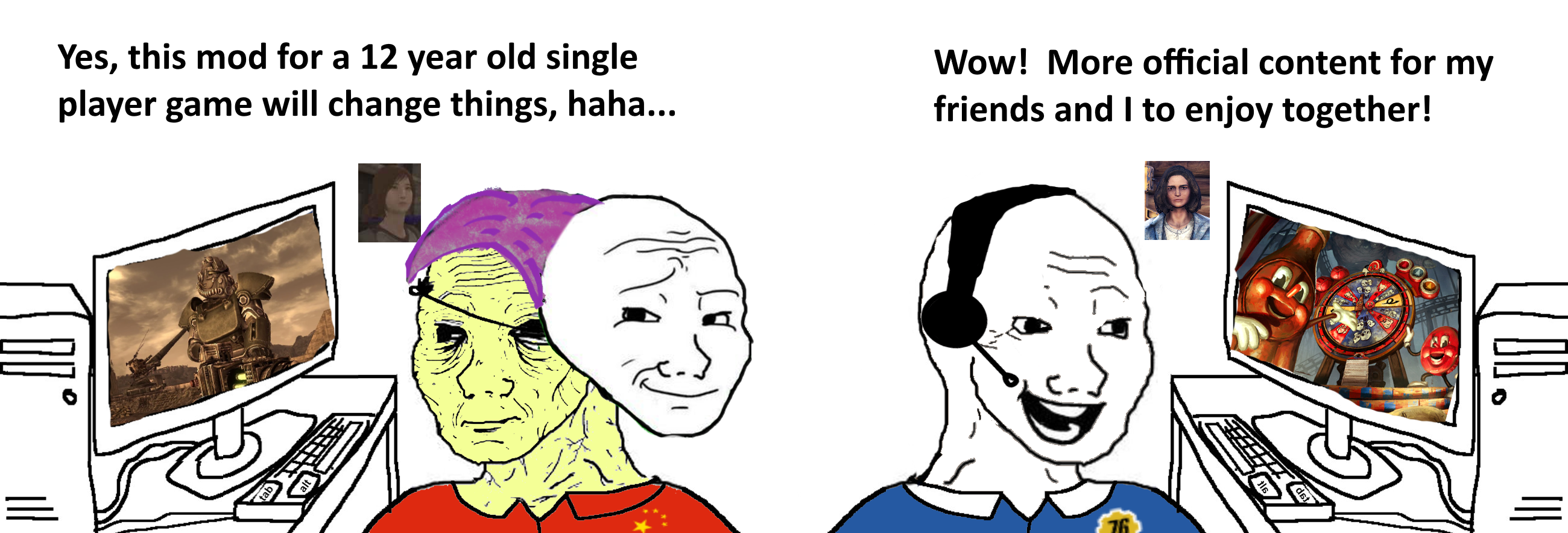look how brainwashed some of the fans0is are if you add grass and nice weather to fallout 3 and how they seethe over it. earlier I had a guy get into it with me because I said I wanted to see more added to the games and not just cleaning up a few things like he wanted and he went on about the spirit of the game and getting all autistic about changes happening. you know what I mean by that. we see it in game threads. someone says something and someone gets all overly invested in making sure everyone knows THEY do not agree and it needs to be done this way only and all autism about it. finally he shut up when I basically called him out on trying to play the spirit of the game and og devs cards as excuses to keep the game stagnent and locked in place and not making it better and told him those are thing you care about I dont and he just stopped replying.