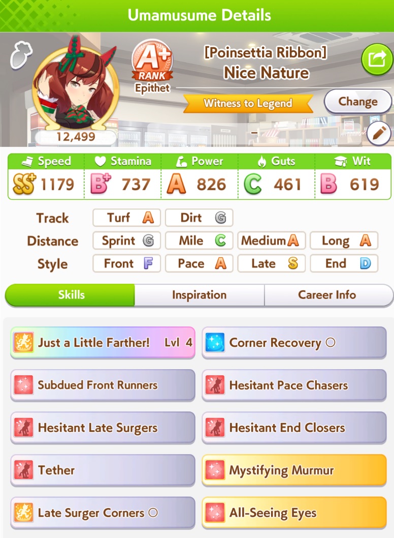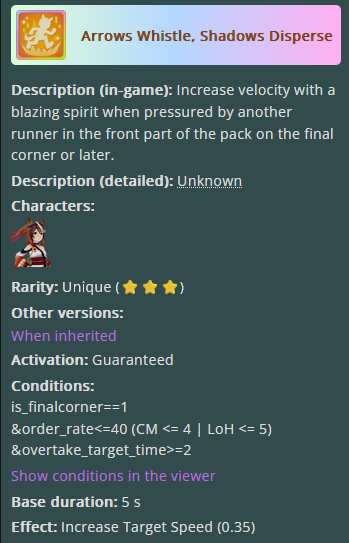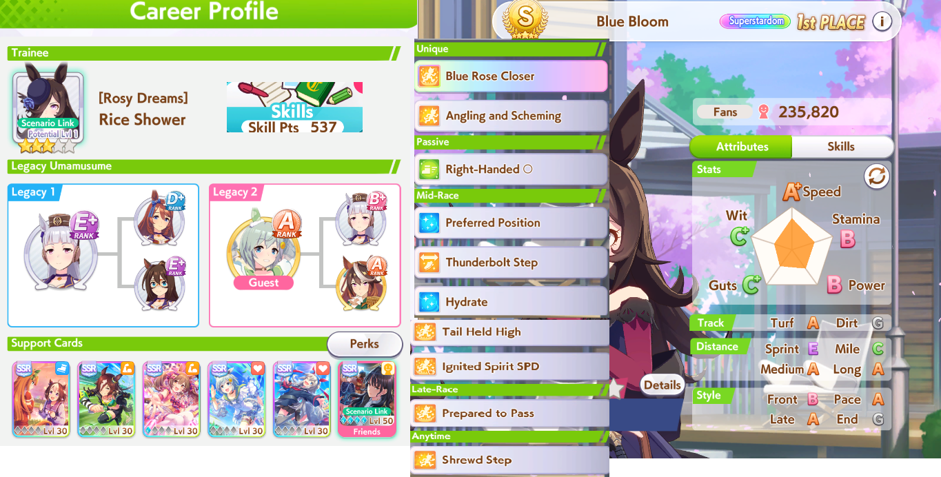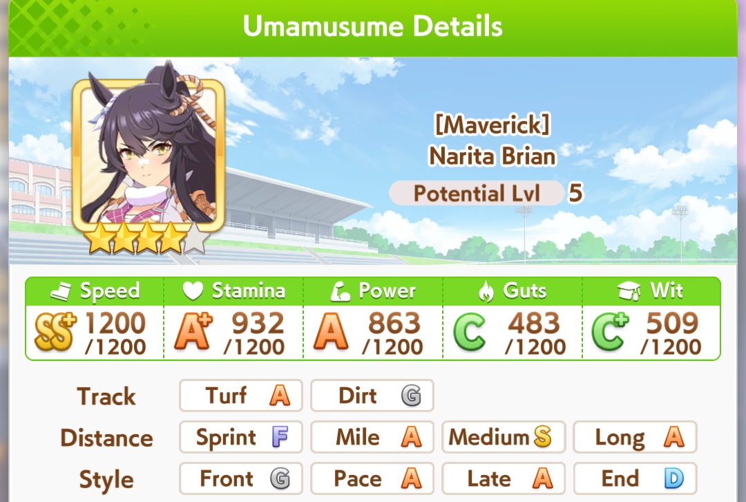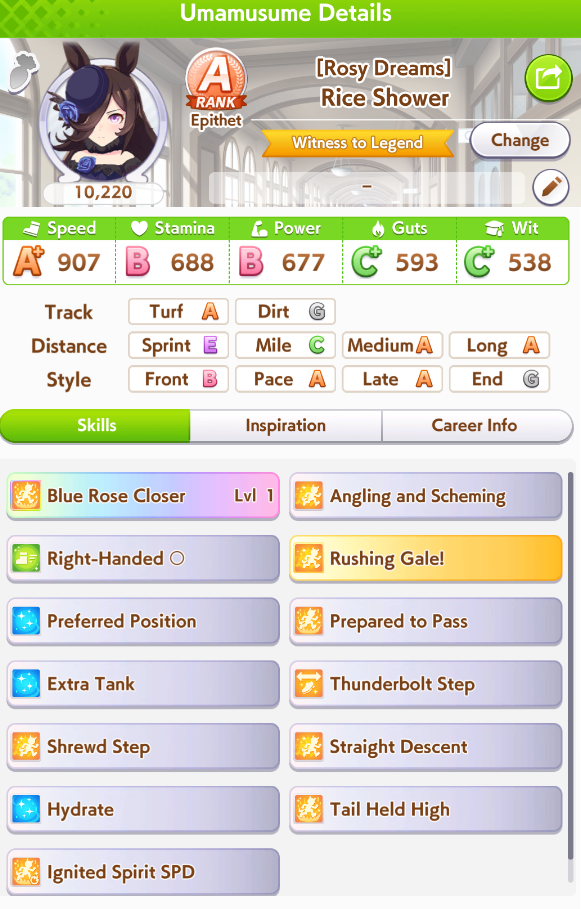 >>550457820eh, all OG rice has going for her is innate highlander. OG vs vamp in pace promote i'd still take vamp for calm and collected's reliable activation over cooldown's irregular activation, plus vamp's better growth bonuses>>550457940sorry buddy. S turf and 1015 power makes my rice pretty hard to overtake. I was trying to use groundwork daiwa for pace promote strats but she consistently couldn't secure the lead against my rice so I had to give up on the idea.