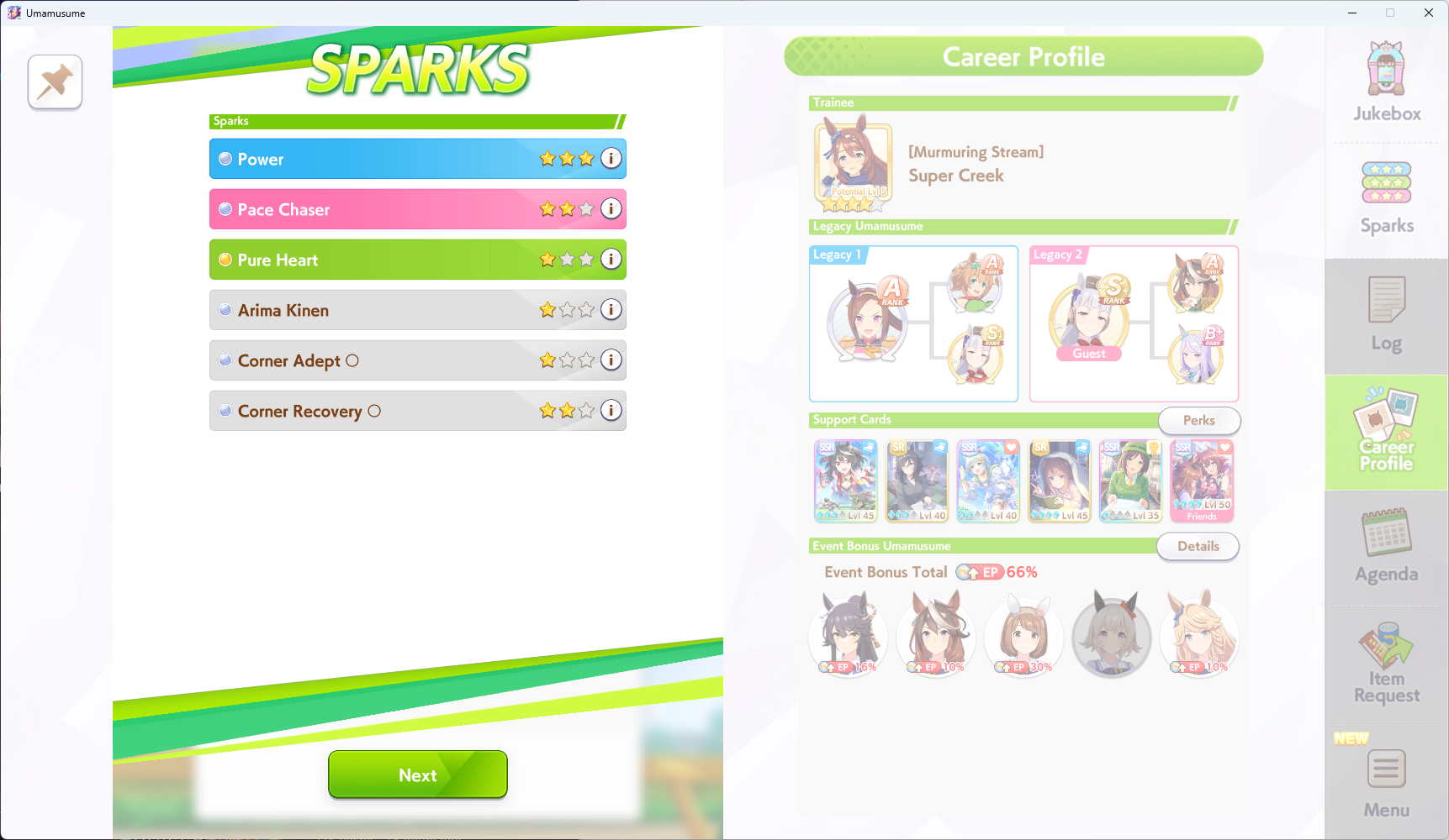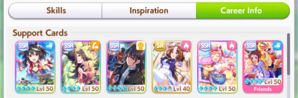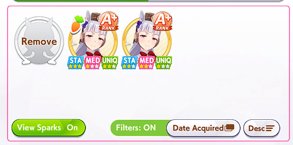 >>550471513Nice, having a 9* is very helpful to start out with. Down the line you'll want one with more diserable pinks, which is mostly distance for upcoming CMs (or turf) and white sparks for the skill hints you want on your trainee to learn and scenario sparks for big stat gains.