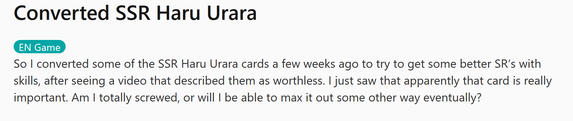 >12 hours for matchmakingI'm still mad this is a thing. Just run the races. This should take 20 mins, the servers aren't THAT slow. And while you're at it release Kitasan