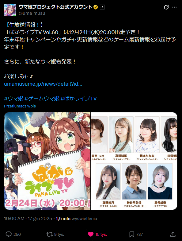 Previous: >>550442105>Global Game NewsUmamusume wins Best Mobile Game at Game Awards 2025Current Scenario: Aoharu Hai aka "Unity Cup"Current CM: Libra Cup - Kyoto Turf 3000mCurrent Event: Orchestra in Late AutumnCurrent Rate Up Trainee: Manhattan Cafe (3*), Symboli Rudolf 3* [Archer by Moonlight], Gold City 3* [Autumn Cosmos]Current Rate Up Support Cards: Nakayama Festa (SSR), Sirius Symboli (SR), Curren Chan SSR [Cutie Pie With Shining Eyes], Narita Brian SSR [The Whistling Arrow's Taunt]12/17 - CyGames ID Store link-up12/18 - Kitasan Rerun12/24 - Fuji Event12/28 - Scorpio Cup - Tokyo Turf 2000mhttps://umamusume.com/news/100040/https://pages.snep.pw/uma/anni-skill-changes/>JP Game NewsCurrent Rate Up: Oguri Cap 3* [Cinderella Grey] Inari One (SSR)New Scenario "Yukoma Hot Spring" releasedTimeline: https://uma.moe/timeline>IP NewsUmamusume Cinderella Gray 2nd season started weekly airings on 10/5>Thread Clubshttps://rentry.co/umaglobalclublistYou must be E3 (20k points) to join a circle. Apply with /uma/ or /vg/ in your profile or post ID in the thread.>All Guides & Resourceshttps://rentry.org/uma26Game databasehttps://gametora.com/umamusume (Click the gear to switch between JP / global server info)A basic guide for newfagshttps://rentry.org/umaglobalFind networks if your region is blocked from the game or clienthttps://www.umavpn.top/93Seiyuu & Concertshttps://rentry.org/umstUma storieshttps://umareader.idsmile.xyz/