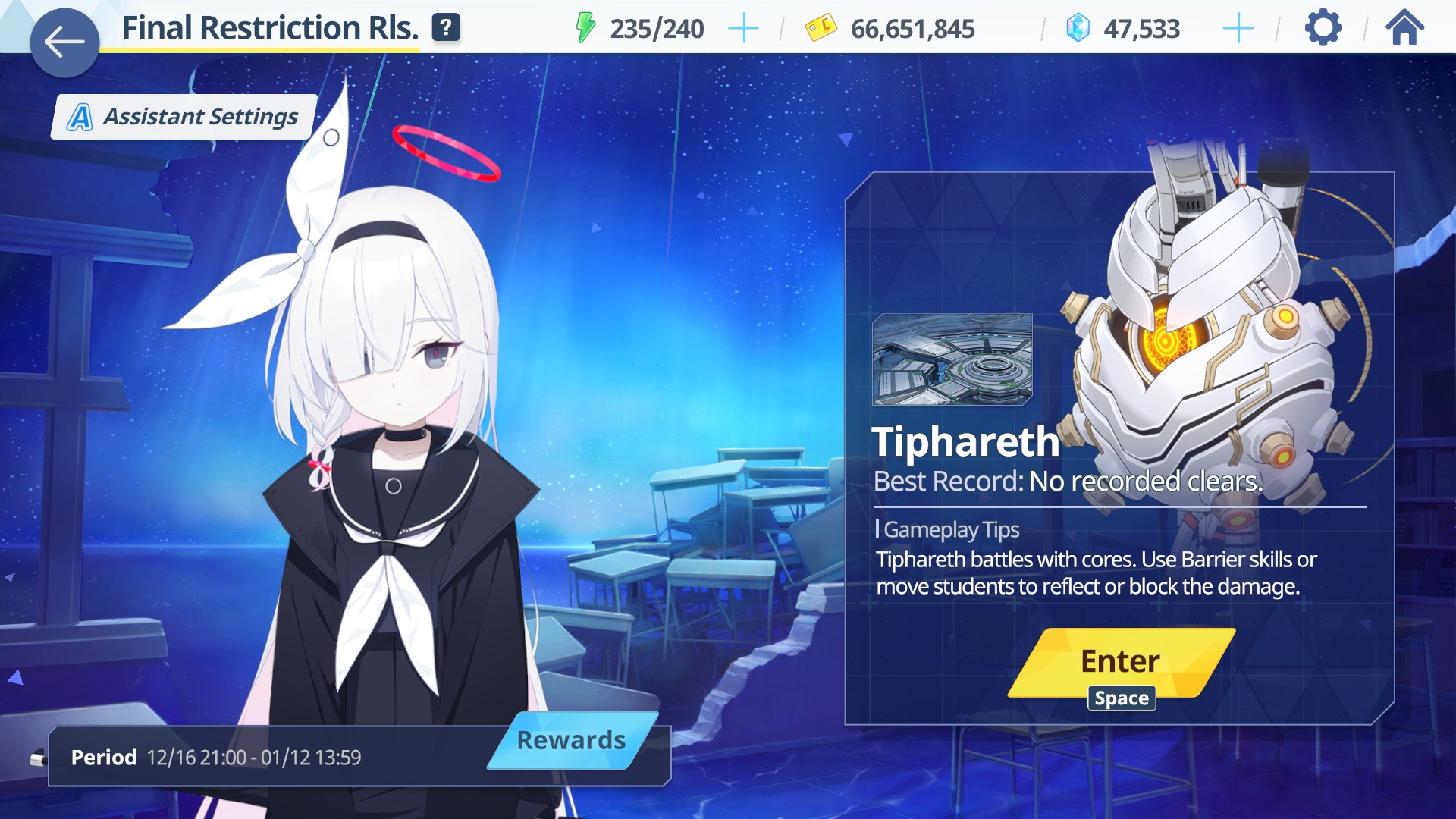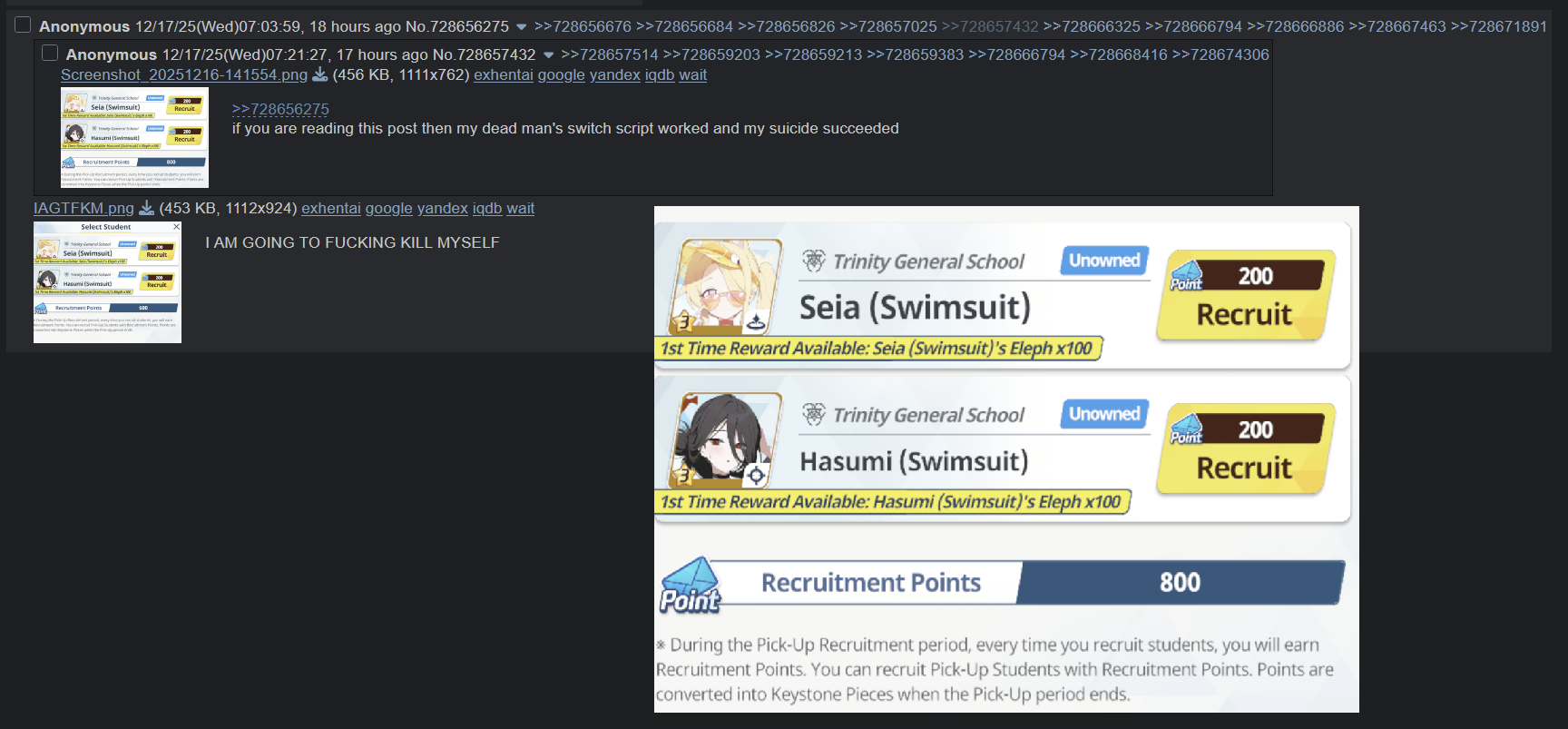 Previous Thread: >>550444203>Guides, Resources and useful links:https://rentry.org/bagguides>/bag/Circles/Clubs/Friends:https://rentry.org/holdingthebag>4koma, Manga, Side Content, PVs & Shortshttps://rentry.org/bacontent>>(JP) – JST>Banners:>12/17 11:00 – 12/24 10:59Meru, MomijiMinoriShigure (Hot Spring)Serika (Swimsuit)>News:Christmas Livestream: https://youtube.com/live/To4kTwOHslU – 12/20 19:005th Anniversary Website: https://5th-anniversary.bluearchive.jpPatch notes: https://bluearchive.jp/news/newsJump/609>Events:Balancing Schale's Books with the General Student Council – 12/17 11:00 – 12/24 10:59>Content:Limit Break Assault: Chokmah (Outdoor – w/Heavy Armor) – 11/20 11:00 – 12/24 3:592x Commission – 12/17 4:00 – 12/24 3:59>>(GLOBAL) – UTC>Banners:>12/16 After Maint – 12/23 1:59Hasumi (Swimsuit – Limited)Seia (Swimsuit – Limited)Ichika (Swimsuit – Welfare)>News:Patch notes: https://forum.nexon.com/bluearchive-en/board_view?thread=3302503Roadmap: https://bluearchive.nexon.com/events/2025/12/4th>Events:Summer Sky's Promise – 12/16 After Maint – 12/30 1:59100-Free Recruitment Event: https://forum.nexon.com/bluearchive-en/board_view?thread=3302497Teatime on the Beach: https://bluearchive.nexon.com/events/2025/12/teapartyMy Office: https://bluearchive.nexon.com/user/myofficeSpecial Survey: https://forms.gle/4DaM3bvLkqAkvX7q9>Content:Total Assault: Hod (Urban) – 12/23 2:00 – 12/29 18:59Limit Break Assault: Tiphareth (Indoor – w/Heavy Armor) – 12/17 2:00 – 1/12 18:593x Bounty/Lesson – 12/15 19:00 – 12/22 18:592x Account EXP – 12/19 19:00 – 12/21 18:593x Normal – 12/22 19:00 – 12/26 18:592x Account EXP – 12/26 19:00 – 12/28 18:59