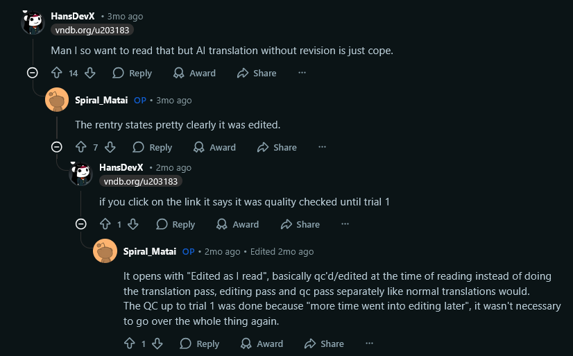>>550478521Even with all the comments calling him a retarded MTL shitlord, the slop consumers outnumber them. The reddit visual novel community just has low standards. They also love Umineko and gacha games btw.