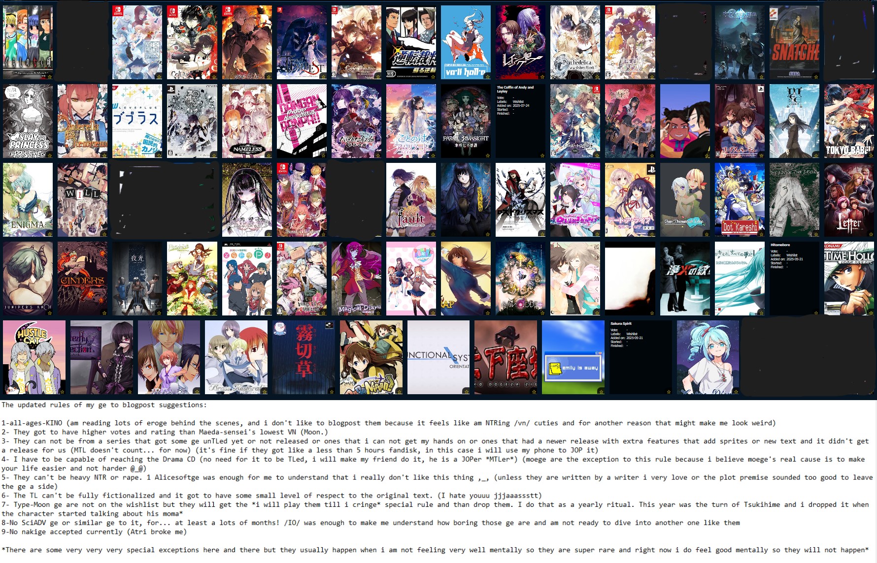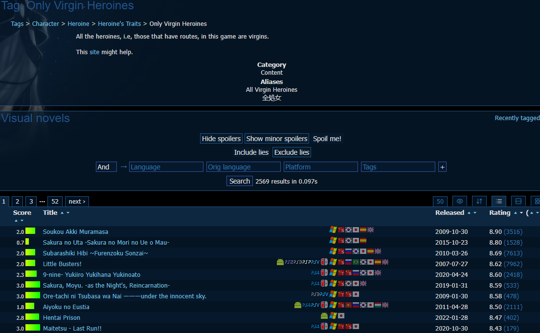 We need spoilers for all of thishttps://vndb.org/u35602/ulist?q=&ch=&f=&l=10&s=31w
