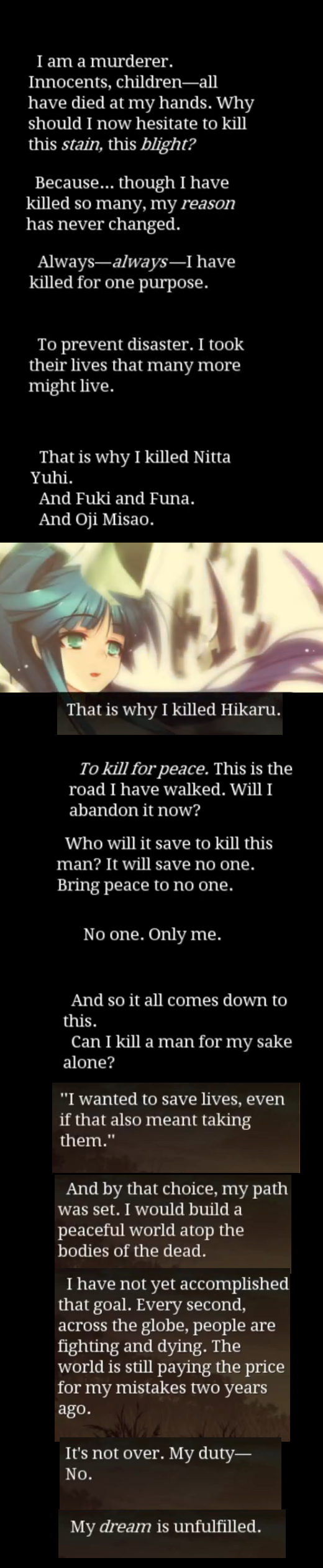 >>550510708Except fictional characters having unrealistic ideals doesn't invalidate the game. It's not like Kageaki's ultimate goal itself is the only thing the game focuses on.