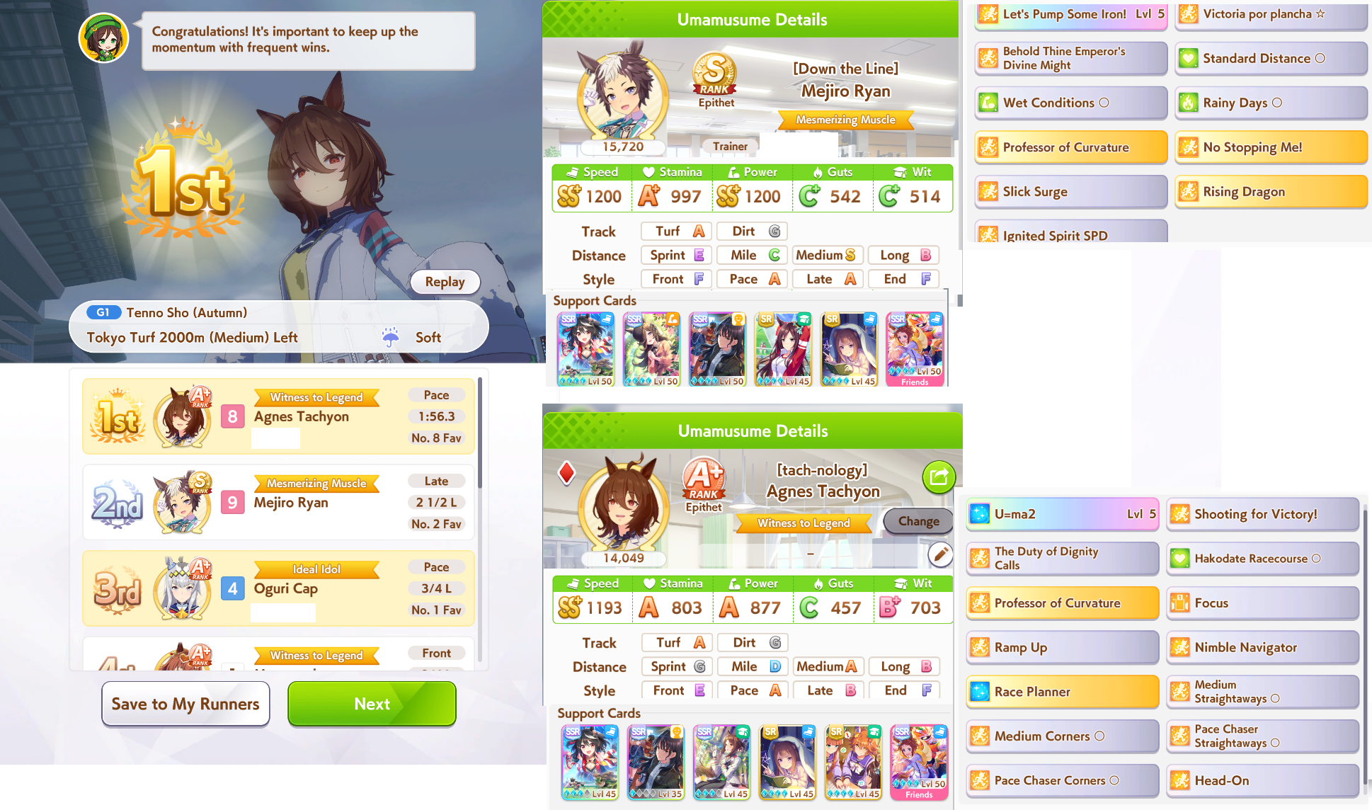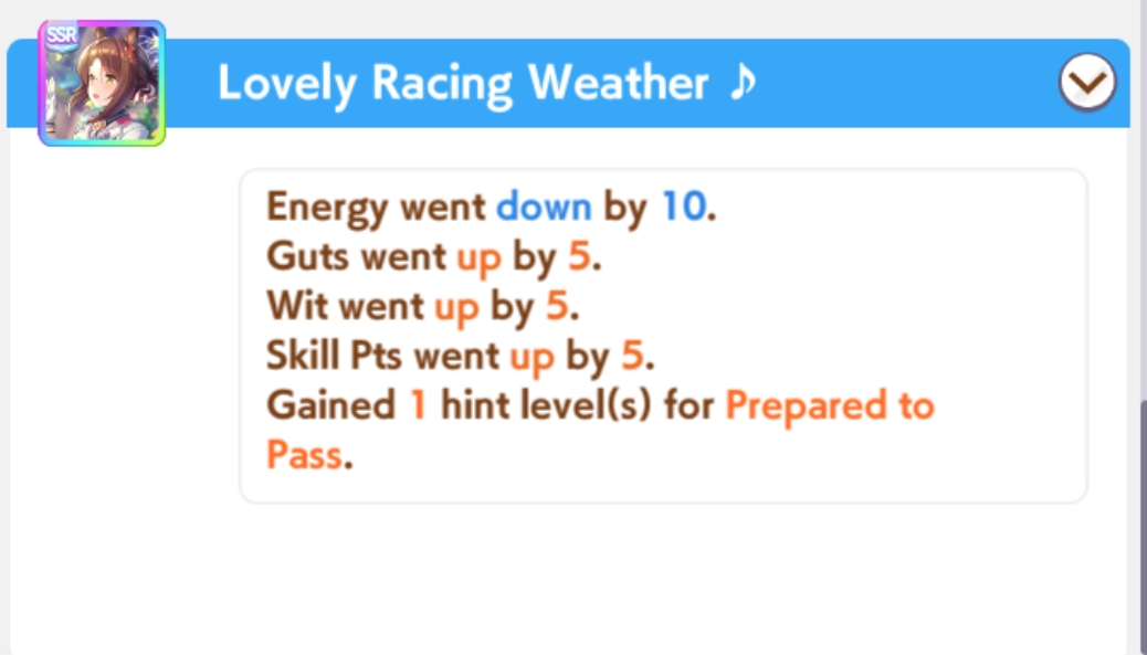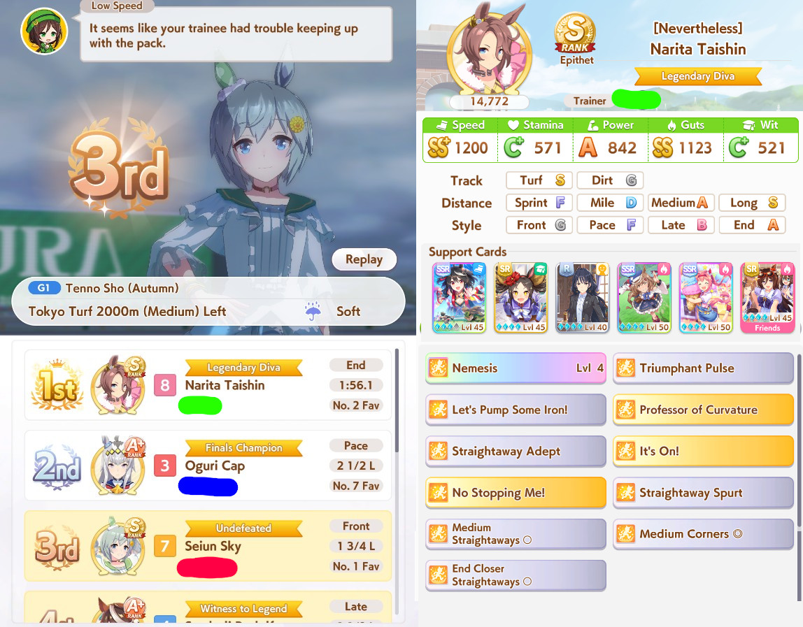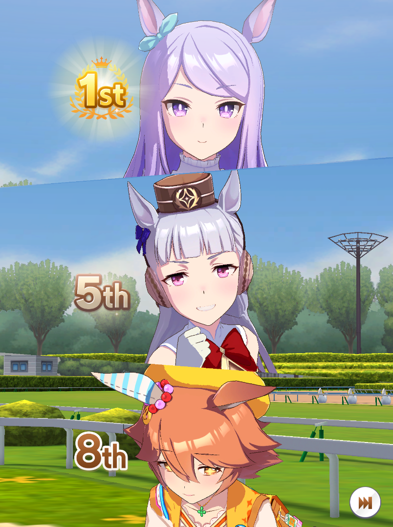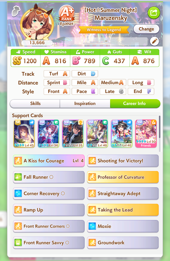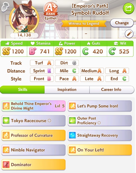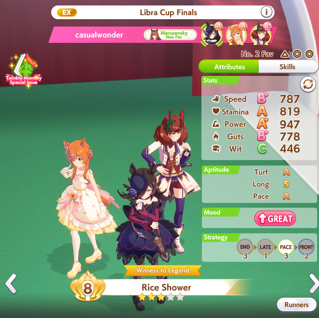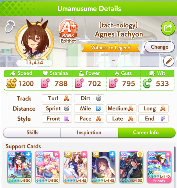 >>550517392I won against a 1200/1200/900 cafe with my own 1200/900/800 cafe. Other guy used a very similar ace I made that everyone stated was shit with no Accel skills, so they and I feel vindicated after remaking my Cafe Ace with some mod Accel skills