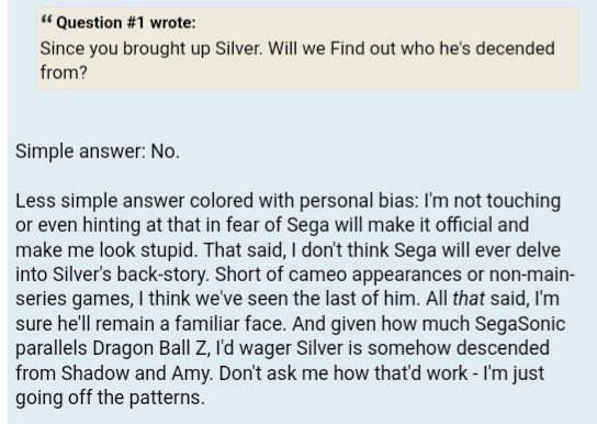 >>550521805This is turning into a pet peeve of mine. The person who wrote all that put more thinking into Sonic than SEGA does.If you're putting more thought into characterizations than SEGA does, then you've already lost the plot.