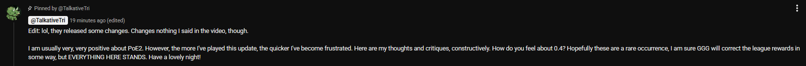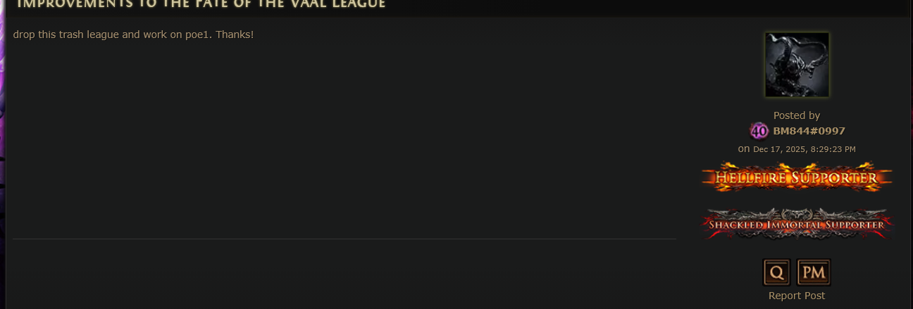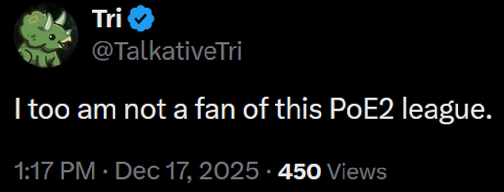 Huge patch tomorrow that will fix everything in PoE2and PoE1 won't be forgotten, we will get a couple 1 month leagues for over the holidays there too!Jonathan won't abandon us.