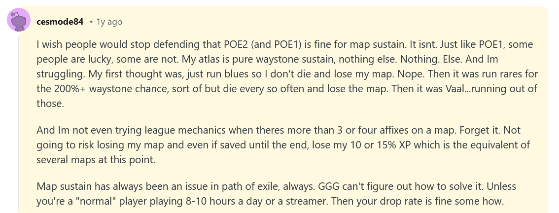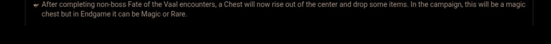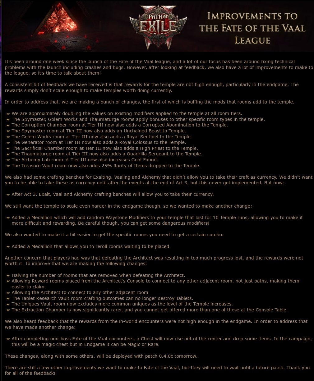 >There are still a few other improvements we want to make to Fate of the Vaal, but they will need to wait until a future patch. Thank you for all of the feedback!thats it, right? poe1 is fucked in the assagain1 month vacation into 1 month working on fate of the vaal3.28 should be out 2 weeks from that point? oops :)
