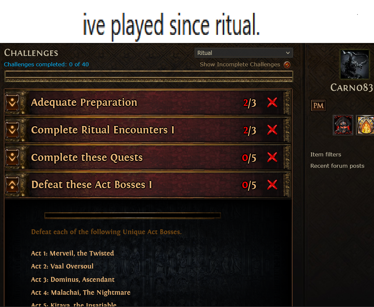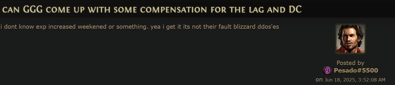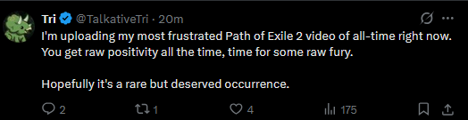 I dunno, bros. Like, I want to play, I get the itch to play, but I league started a druid and it's just been such a slog. It took me 4 days to make it to the interludes and then I realized this is it, this ultraclunk 6 button mmo rotation is just how my build will always play, this is how all druid builds play, and I just haven't had the motivation to log in since.