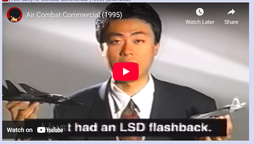 Since we got the trailer, wanted to share some old tone-deaf Ace Combat western TV ads. At least these days we're getting an honest look at the tone of the game.AC4, far more silly than the tone of the game:https://www.youtube.com/watch?v=JrjQnPWRyUMAC6, much more western-epic than the cheese tone from the actual gamehttps://www.youtube.com/watch?v=tgqwAAJcdxEAir Combat's the only one that seemed to get the tone of the game righthttps://www.youtube.com/watch?v=Sh4fIVZsDdA