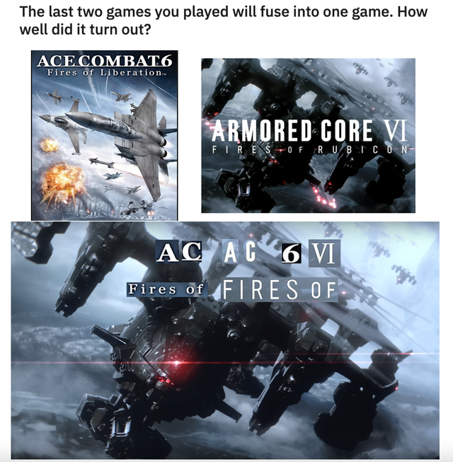 >>550679581I remember when I was playing through ACVI (please) I kept accidentally calling it Ace Combat 6 when talking about it. I had to stop myself mid sentence just to get it right. It really doesn't help that it's the same publisher.Honestly Armored Core x Ace Combat crossover when?