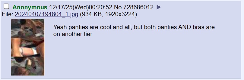>>550748072There's also this official art, I've always thought that it's weird or out of place, she took off her panties and they are right there, it's official art as I said but I don't think it's something she would do. That said, Hinako doesn't mind the fact that her reflector outfit is revealing considering that it shows her cleavage, among other things...trying to judge her character, maybe Hinako doesn't like being sexualized (not to mention getting unwanted comments because of her features, see her interactions with Ako) but it depends on the context or outfit, probably, if that wasn't the case maybe she would complain about her reflector outfit, something she doesn't do...but who knows.Related to the post itself, there are few Blue Reflection characters that, I imagine, would't mind undressing in front of other people, would be indifferent or at least it would be something like ''if it's for you, I'll do it'', but they are very few and those characters are...Rin (if it's the boy she loves), Yuri, Uta...and maybe Yukiko Takaoka and Morisaki Alesia Yu...all the other characters would be like ''it's embarrassing'' or ''no, I won't do it'' maybe.Yeah, this is related to the previous post.