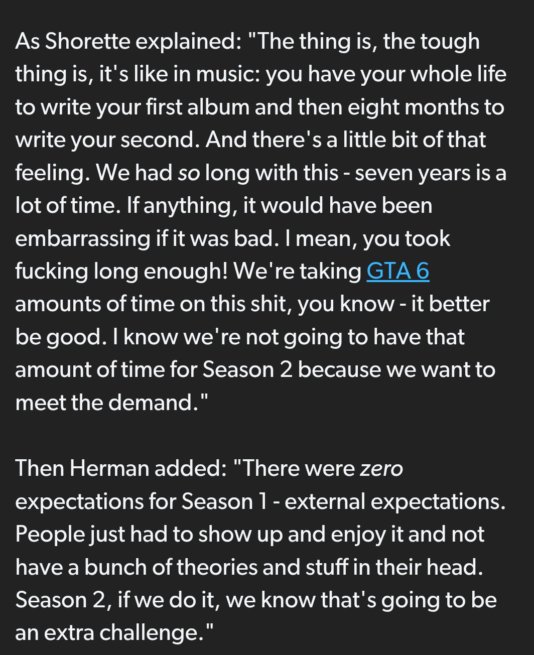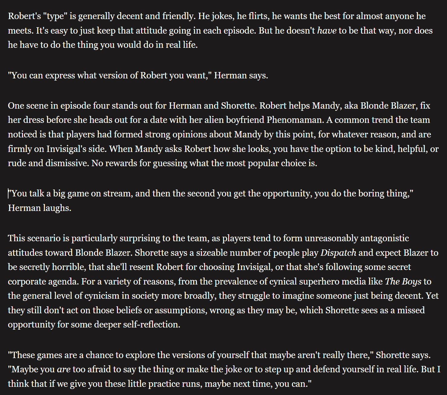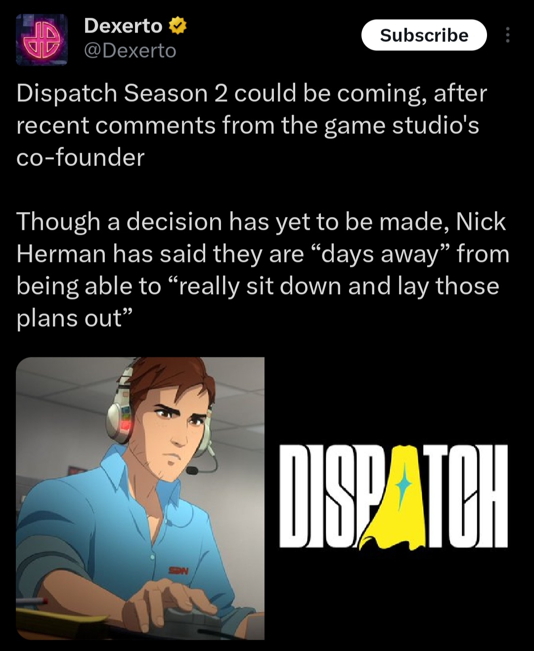 >>550561295Like they mentioned, what seems to be the real difficulty now is managing story expectations. They could easily write a dog shit script for S2 and things come tumbling down. But I have a feeling we're gonna see Dispatch season 2 within 3 years.