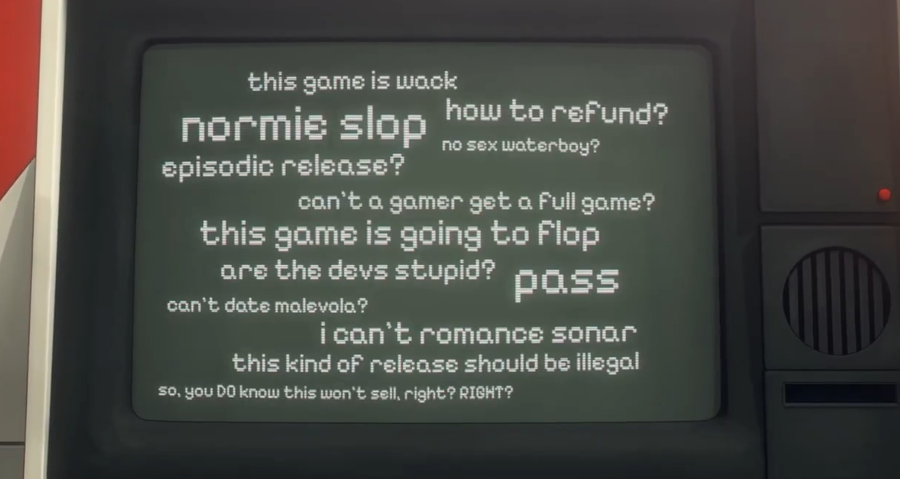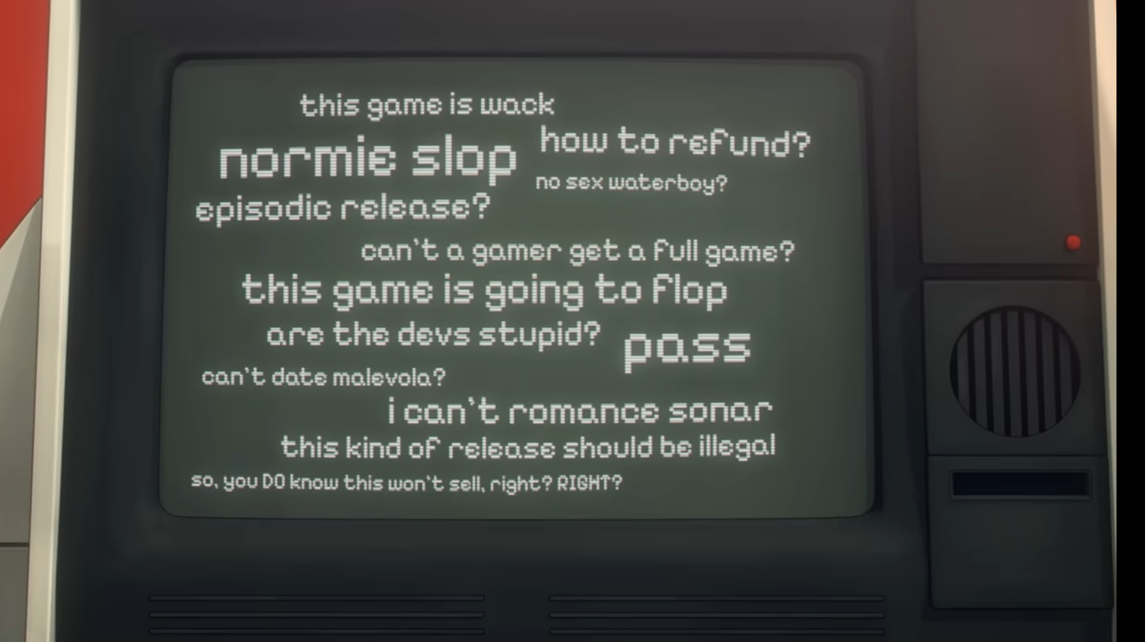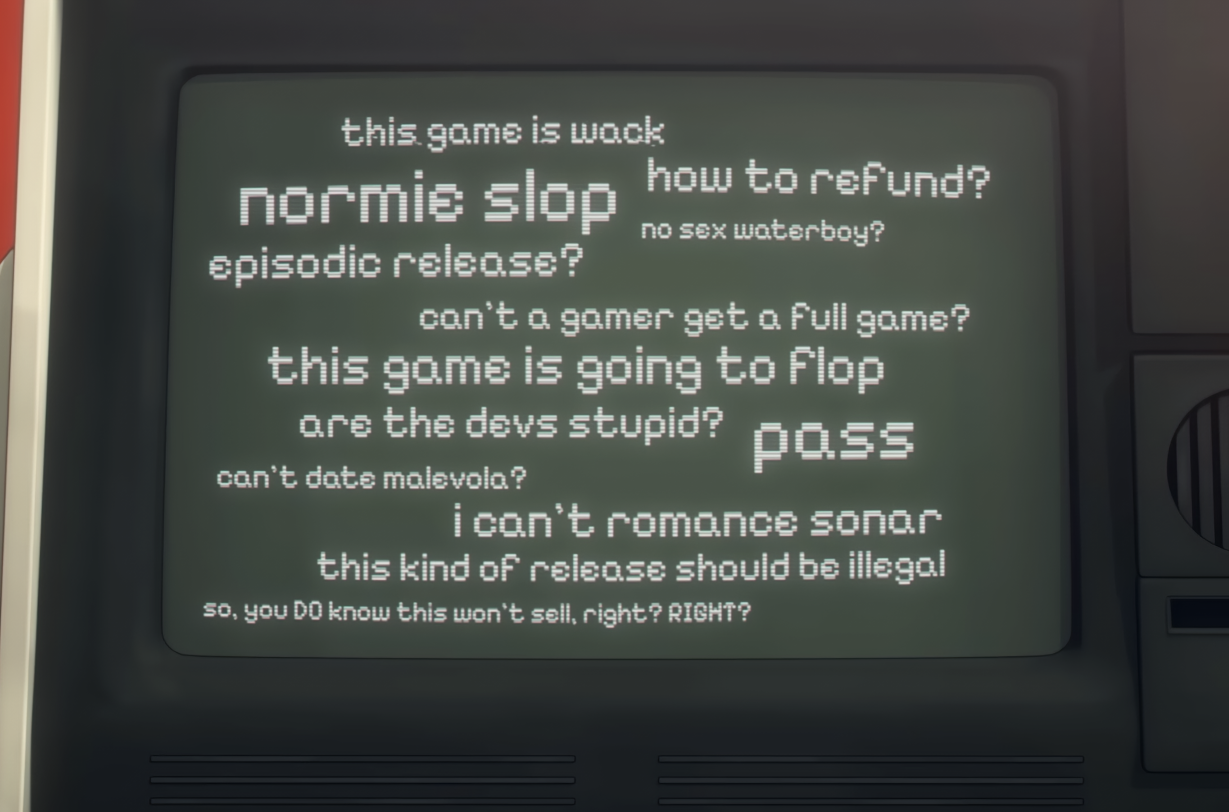 >>550579935>I didn't mind Sonar that muchI think his performance in the dispatch minigame + most scenes is okay. but his performance in the final battle that happens if you cut him is so cringe. >>550580801>cr1ical's voice always came off as jarring to me, like he's forcing it deeper on purpose and could talk normally if he wanted tothat happens with malevola's too. sometimes she sounds weird. like in that board room meeting. >>550569101>I like the dream but the game in it's entirety is from Robert's pov. dont you think it's a bit weird that's the only scene it isnt?Yeah so, here's the thing: if you choose the BB route, that wet dream scene sticks out from the flow of the game. but if you choose the visi route, the dream is more coherent. but yeah. It would've been a lot better if the devs made two separate "wet dreams" per the 2 options. if you choose visi, its the wet dream. but if you choose BB, maybe a dream about blazer and robert living life as civilians or something. they really missed out there.