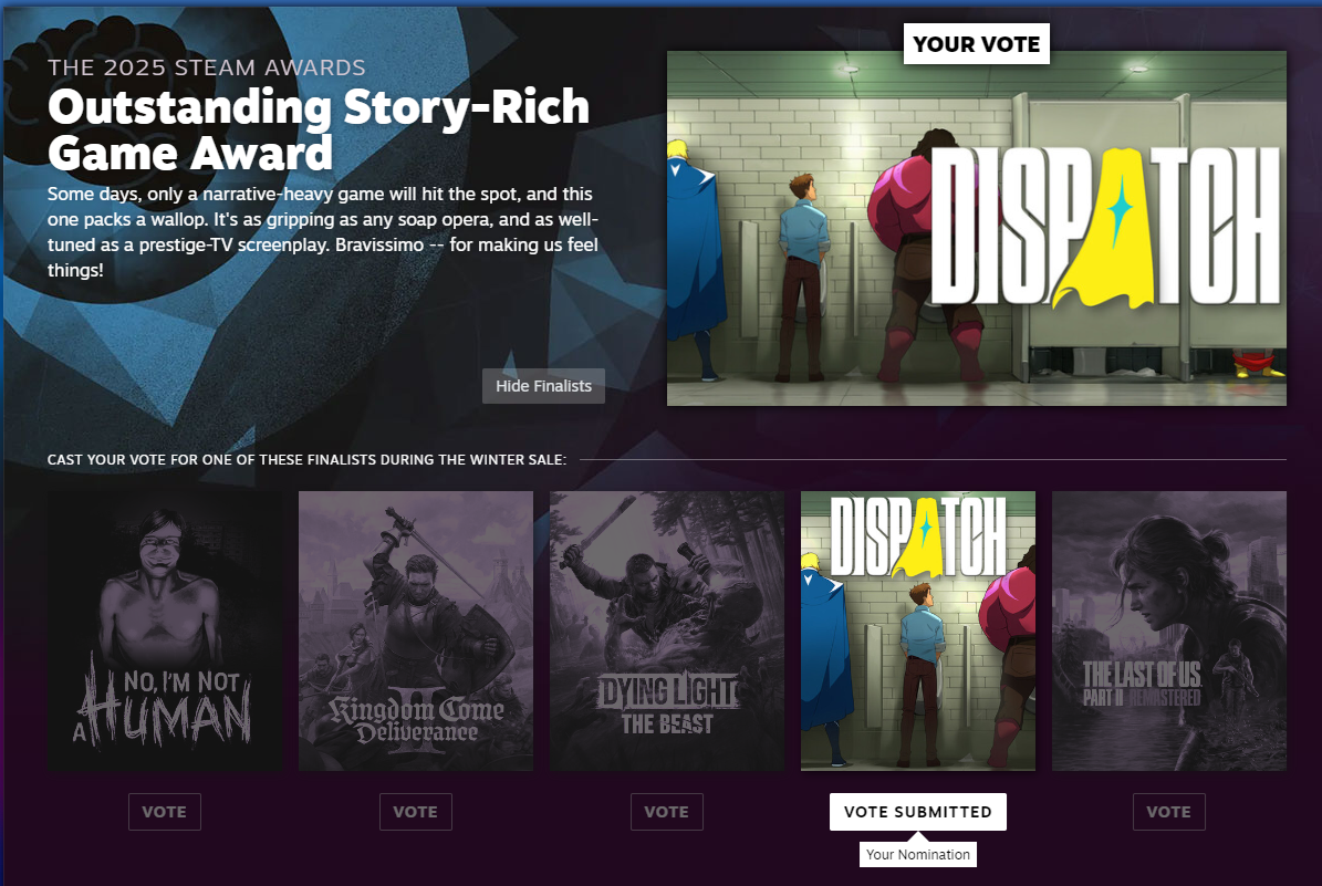 Christmas Prank EditionA general thread to discuss Dispatch by AdHoc Studioshttps://store.steampowered.com/app/2592160/Dispatch/>Dispatch merch storehttps://store.adhocla.com/>Dispatch fanart contestEnter your Dispatch-themed creations for a chance to win some prizes!Deadline to submit is January 7, 2026. AdHoc employees will conduct a rigorous internal vote and the winners will be announced about a week later. (When exactly? How many winners will there be? TBD, depends on how many entries we receive!) Prizes will be a mix of digital and physical goodies.By submitting your work for the contest, you agree to allow AdHoc to share it on socials!Send a submission now: contest@adhocla.comPrevious: >>550421767
