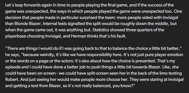 Had they never had the Visi dream sequence and just kept things from Roberts pov, would the romances have been more 50/50 in initial support? The dream sequence pretty much confirmed Visi was into Robert. If they kept it out and kept it vagued I think it would have made the choice more impactful in episode 4 because you would have had to make a choice in the dark relatively speaking