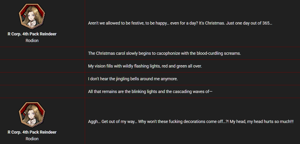 >>550555167>Shooting Rodion with a tranq gun!>Activating emergency Wcorp teleport beacon!>Feeding her Christmas turkey and eggnog!>Hugging her as she breaks down!>Kissing her tenderly!