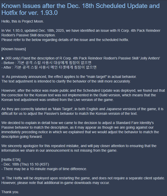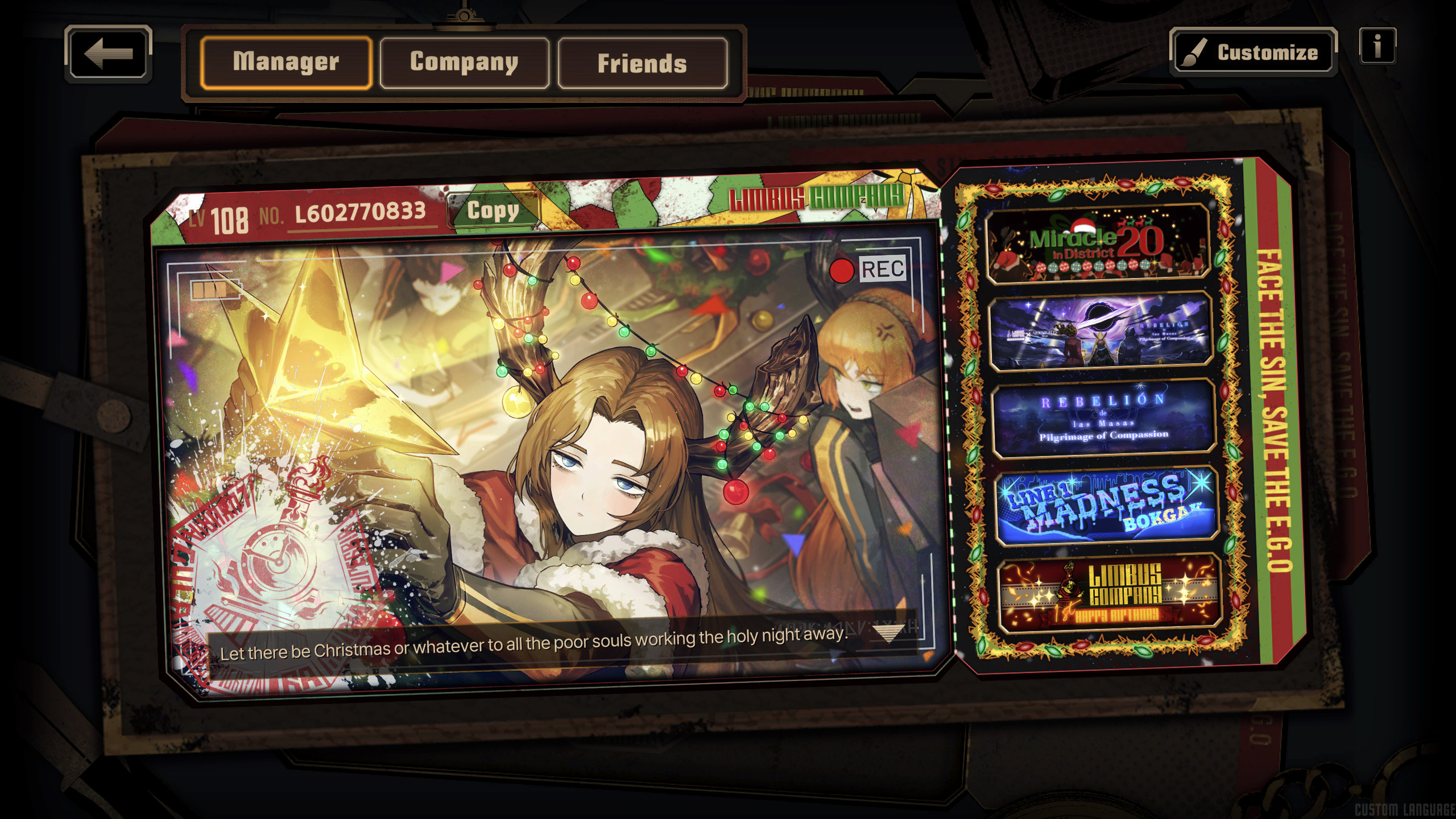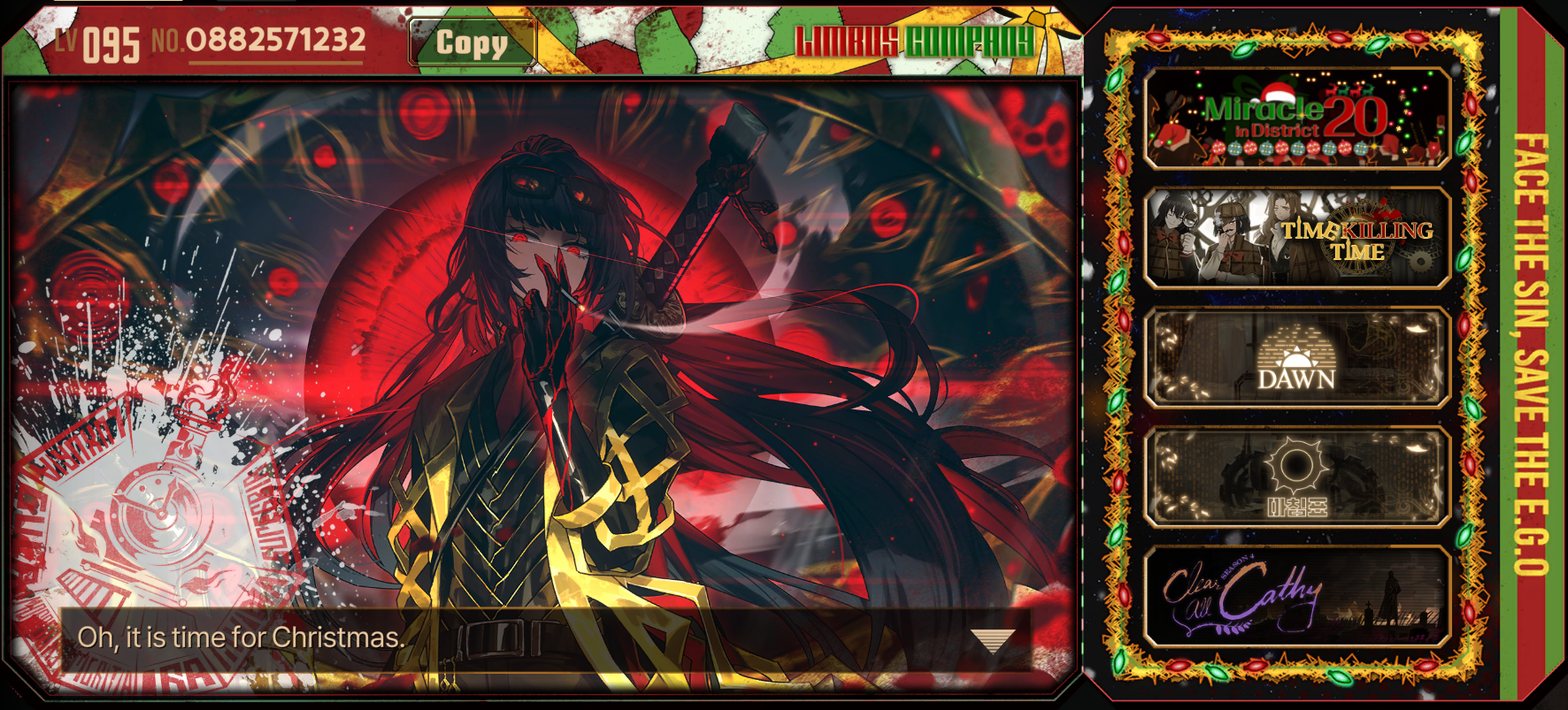 Previous thread: >>550484927Season 6 - 葬花吟 [Zàng Huā Yín]2025.05.15 —Season 7 - Kumo no Ito2025.Mirror Dungeon #6 - Mirror of Immortality2025.07.03 —Refraction Railway Line 5 - Merry Go Round2025.02.20 —>Current Events>Current Extractions2025.12.18 — 2025.12.31[000] R Corp. 4th Pack Reindeer Rodion2025.12.18 — 2025.12.31Target Extraction: [ Outis ] ID & E.G.O>FAQs! This game is directly tied to the setting of Project Moon's previous games, Lobotomy Corporation and Library of Ruina, and is set after both. Expect spoilers for those games in this thread.! The tutorial is important.>Download linksAppStore: https://apps.apple.com/app/limbus-company/id6444112366Google Play: https://play.google.com/store/apps/details?id=com.ProjectMoon.LimbusCompanySteam: https://store.steampowered.com/app/1973530/Limbus_Company/>Other linksOfficial twitter: https://twitter.com/limbuscompany_bOfficial youtube: https://www.youtube.com/@ProjectMoonOfficialOfficial site: https://limbuscompany.global>Required readinghttps://mega.nz/folder/xosDkZ5Z#Wt4JpUt5Bb2XG77pxuuXpw>For all your EGO and Sinner info needshttps://limbus.kusoge.xyz/https://gll-fun.com/en/>Useful resources and a general guidehttps://rentry.org/lcg_resourceshttps://rentry.org/lcbguidehttps://rentry.org/LCB_optimal_grind_guidehttps://lcb-days-since-last-id.carrd.co/https://lcb-days-since-last-ego.carrd.co/>Countdownhttps://lcbcountdown.carrd.co/