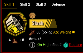 >Defense Skill>Combat Start, gain 8 charge count>Before getting hit, spend 5 charge to gain 2 protection (once per turn)Imagine