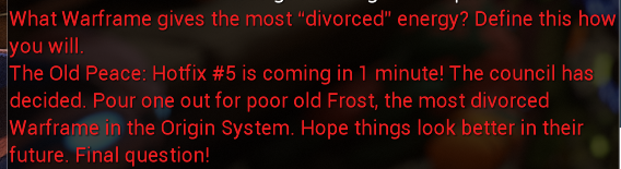 when are they gonna wrap up this Wally shit and move onit's been like 8 years, no answer is going to be satisfying so just rip the band-aid off alreadyCorpus/Grineer politics is way more interesting than old man yaoi and "duuuude what if eternalism lmao"