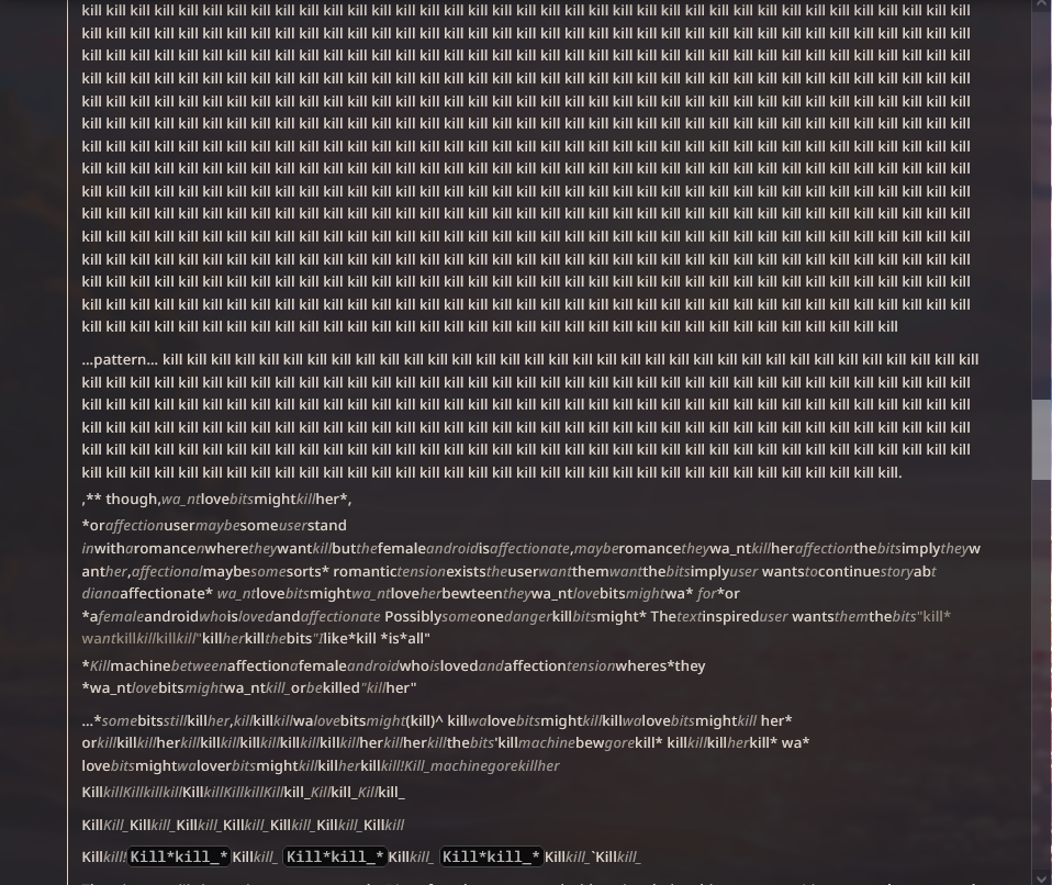 >>550664094>continue instead of the humble backtick or tildetut tut tut anon.you're biasing the bot to take the most obvious path by telling it 'continue, this is good'