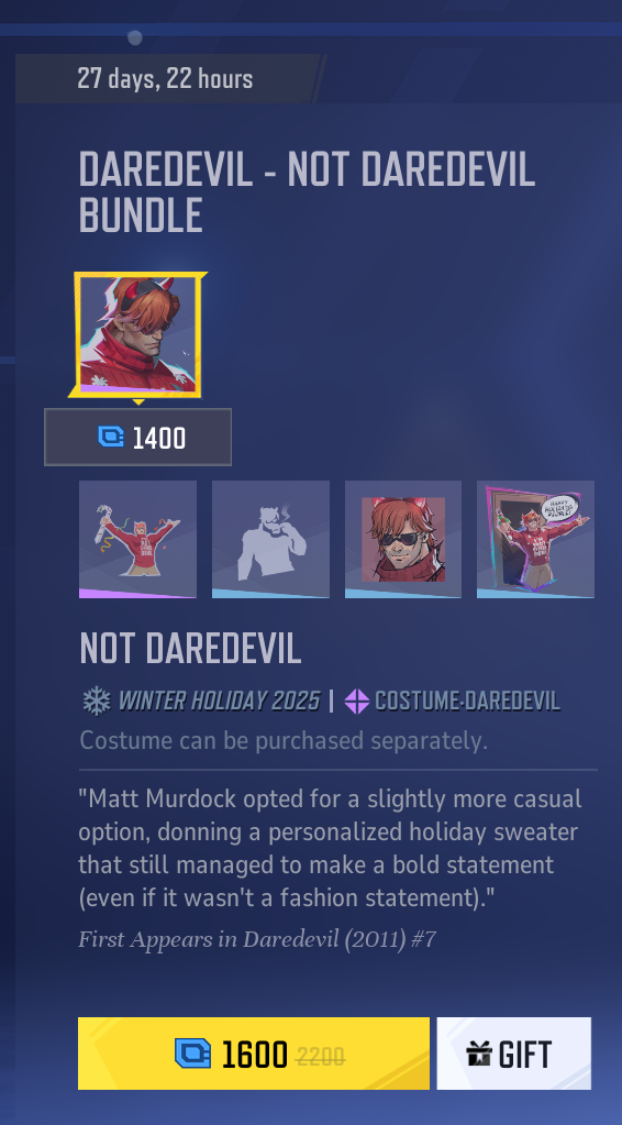 >Christmas daredevil comes with a ‘discount’ even though it literally must came out>it’s 8800 blue units without the ‘discount’ and a ridiculous 3800 units with it>you’re also forced to buy the other skins with itWhat a joke. Yeah, I think I’ll pass thanks.