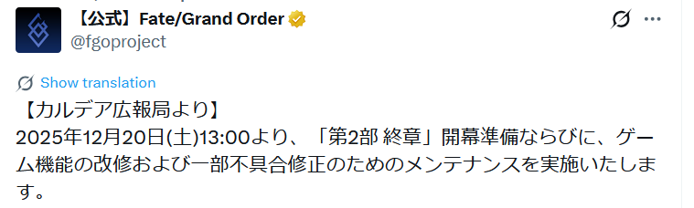 Previous: >>550581345>Part 2 Final Chapter:●Release date: Saturday December 20th 18:00 JST.▶Requirements: Clear OC IV.▶Raid schedule for Tuesday, December 23rd.https://news.fate-go.jp/2025/cil_final_chapter_preface/>Part 2 Final Chapter Pre-Opening Campaign:●December 10~31 JST.▶Login Bonus: 7 Golden Apples.▶Stormpod consumption will be excluded from all Grand Duel (~December 20).▶You will receive 2 Heroic Spirit Apex tickets that can be exchange for one of the 21 limited CEs. ▶All Servants:-Double the EXP when strengthening.-Chances of getting a Great/Super Success will▶Limited Master missions: 23 Stargazer's Teapots, 23 Golden Apples,12 Beast's Footprints and 5 Compass of Retrospection.▶Every servant will have 50% NP Charge at the start of any Main quest.https://news.fate-go.jp/2025/cil_final_chapter_cp/>Part 2 Finale, Heroic Spirit Apex PU summon:●December 10~20 JST.▶This gacha will feature 19 servants and 21 commemorative CEs.▶See the link below for servants and CE lineup.https://news.fate-go.jp/2025/2025_eireikyokuten_pu/>All Servants PU summon:●December 10~31 JST.▶Every Servant of FGO will be on rotation for the rest of December.▶Saber, Archer and Lancer Class:-20~21 and 26~27 JST.▶Rider, Caster, Assassin and Berserker Class:-22~23 and 28~29 JST.▶Extra Class:-19, 24~25 and 30~31 JST.▶Artoria Pendragon (Lily), Oda Nobukatsu, Mary Anning, Habetrotand Kishinami Hakuno (M/F) will be featured in the FP gacha.https://news.fate-go.jp/2025/2025_all_pu/>/fgog/ Friendlist form and spreadsheet (2025):https://forms.gle/WK4dwSC6Mn2WQfZu8https://docs.google.com/spreadsheets/d/1leQ09m5klFajbCcededkANJfeMiAmVz-PbCI_r7xyXc/edit?usp=sharing>Utility links:https://pastebin.com/iaWmXAq7